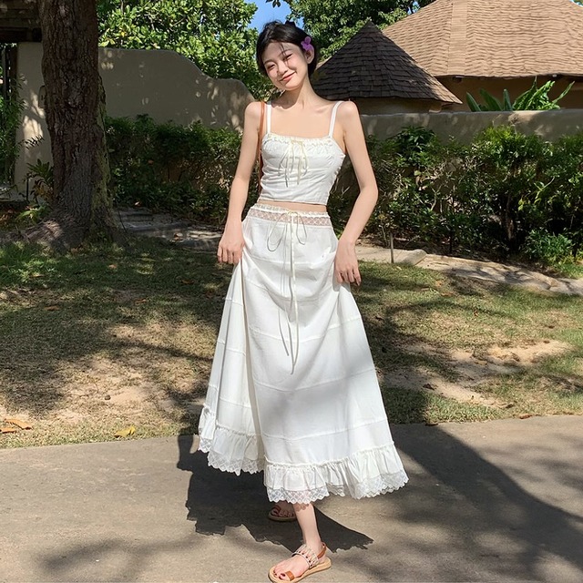 2点セット レースキャミソールトップス+レースロングフレアスカート ホワイト 白 レース フリル セットアップ ウエストレース 清楚 清潔感 お嬢様 フレアスカート 切替えデザイン 夏ワンピ風 夏 サマーワンピ風 かわいい 大人可愛い きれいめ シンプル カジュアル 大人 上品 楽ちん おしゃれ お洒落 大人可愛い 大人女子 こなれ感 ラフ ガーリー ルーズ 春 夏 レディース 学生 韓国コーデ 韓国ファション