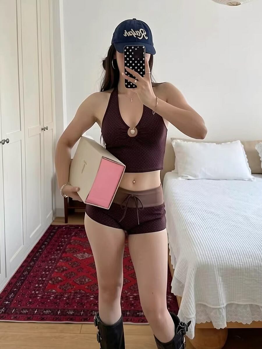 水着 ビキニ タンキニ ブラウンレッド ドットホルターネックビキニ 茶色 赤茶色 レンガ色 ハイウエスト サイドリボン チャーム付き キーホール ホルターネック ボーイレッグ 露出控えめ 露出少なめ 肌見せ少なめ 洋服みたい ガーリー レトロ フェミニン 水玉 ドット ドットプリント かわいい 体型カバー パッド付き ノンワイヤー ワイヤーなし スポーティ 水遊び 大人可愛い きれいめ 華やか おしゃれ スタイリッシュ 美脚 脚長 韓国コーデ 韓国ファション