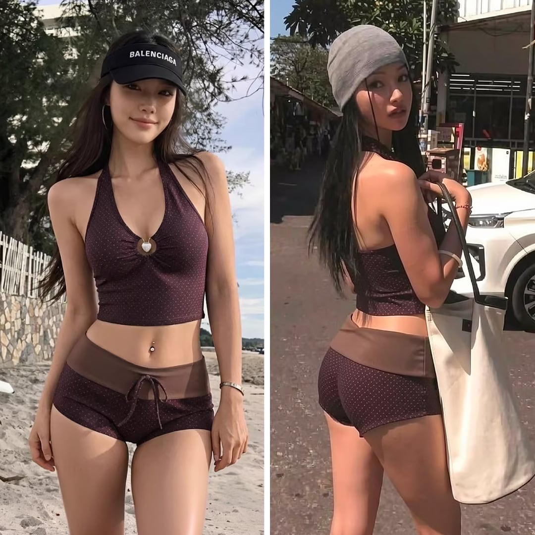 露出度が控えめですが、ホルターネックなので、さりげない肌見せ感があります。