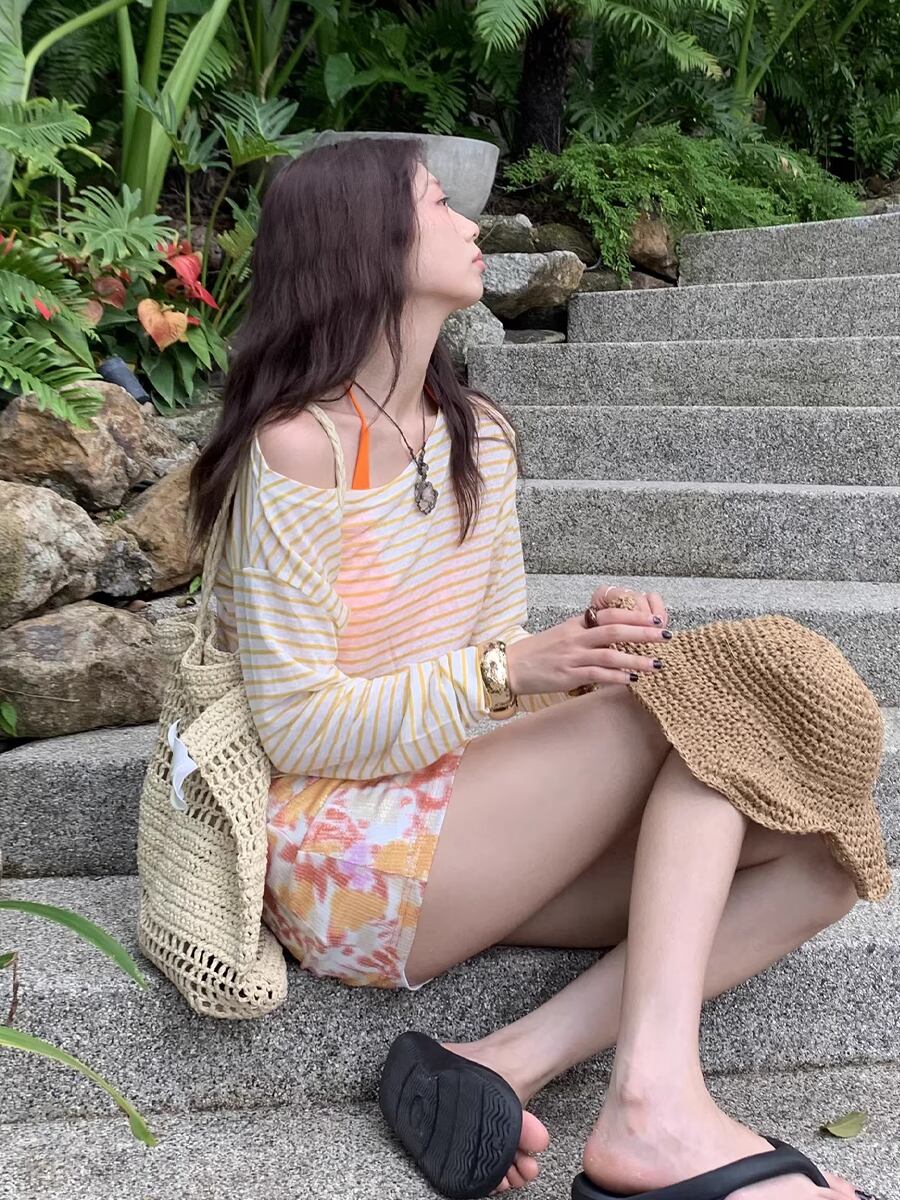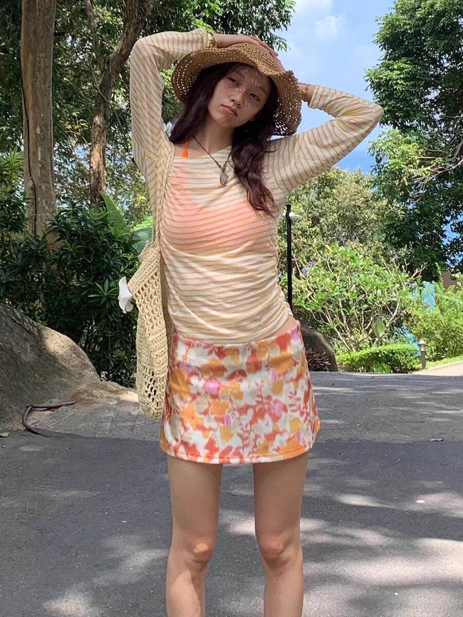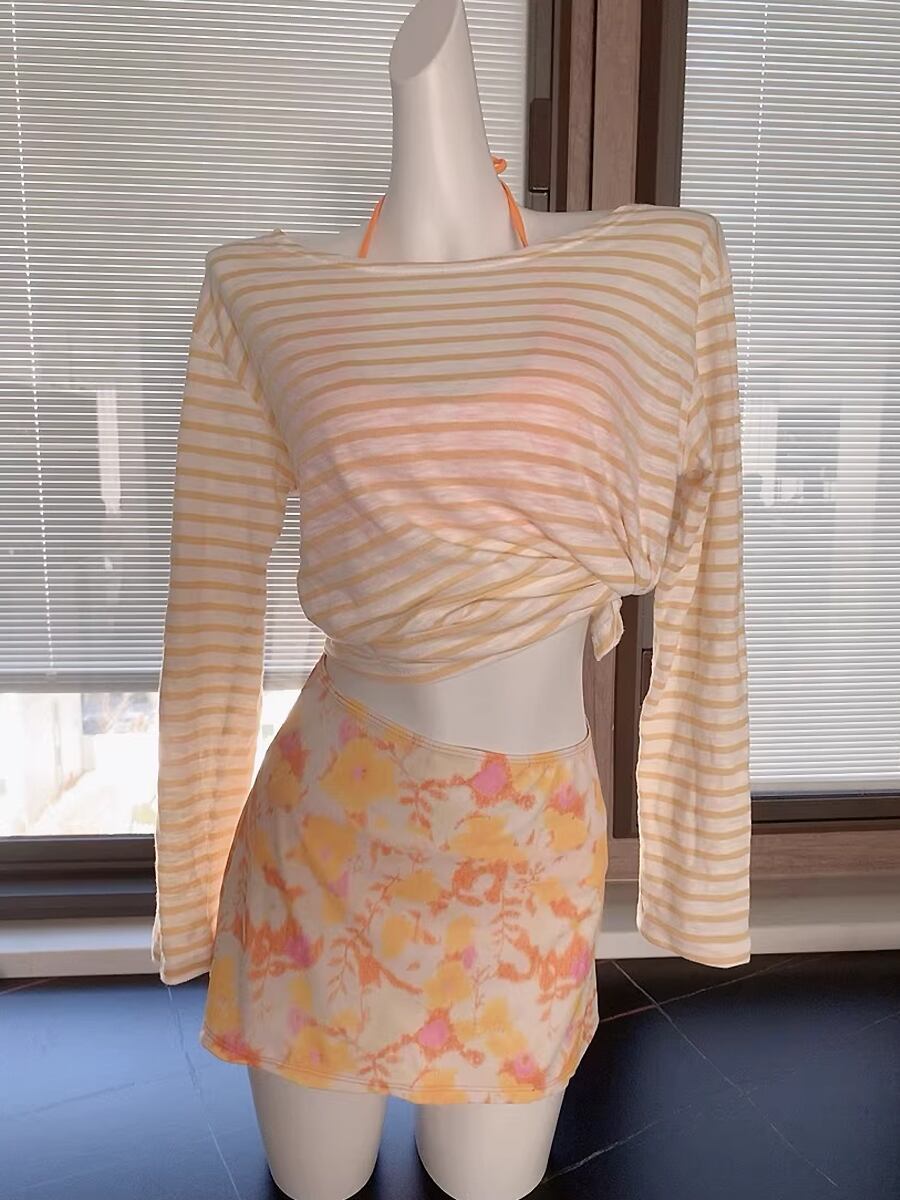 4点セット オレンジカラービキニ上下+オーバートップス+ミニスカート 花柄 フラワープリント ボーダー ホルターネック スポーティビキニ ビキニ ベーシックビキニ ガーリーフェミニン かわいい 日焼け防止 体型カバー パッド付き ワイヤーなし ノンワイヤー オーバーサイズTシャツ ミニスカ かわいい 大人可愛い きれいめ セクシー sexy 華やか おしゃれ スタイリッシュ 美脚 脚長 韓国コーデ 韓国ファション オレンジ イエロー 黄色