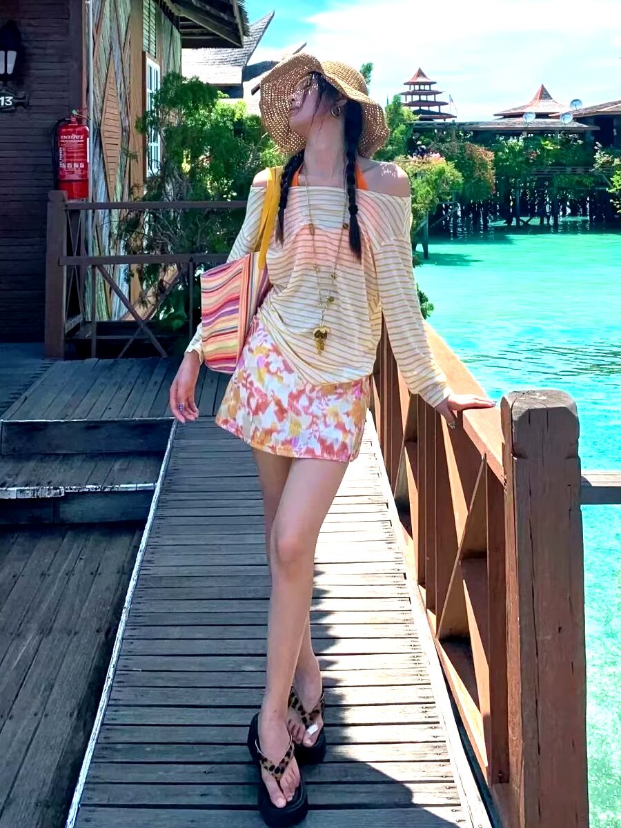 ホルターネックのスポーティなビキニ上下と長袖のオーバサイズTシャツに花側ミニスカートの4点セットです。