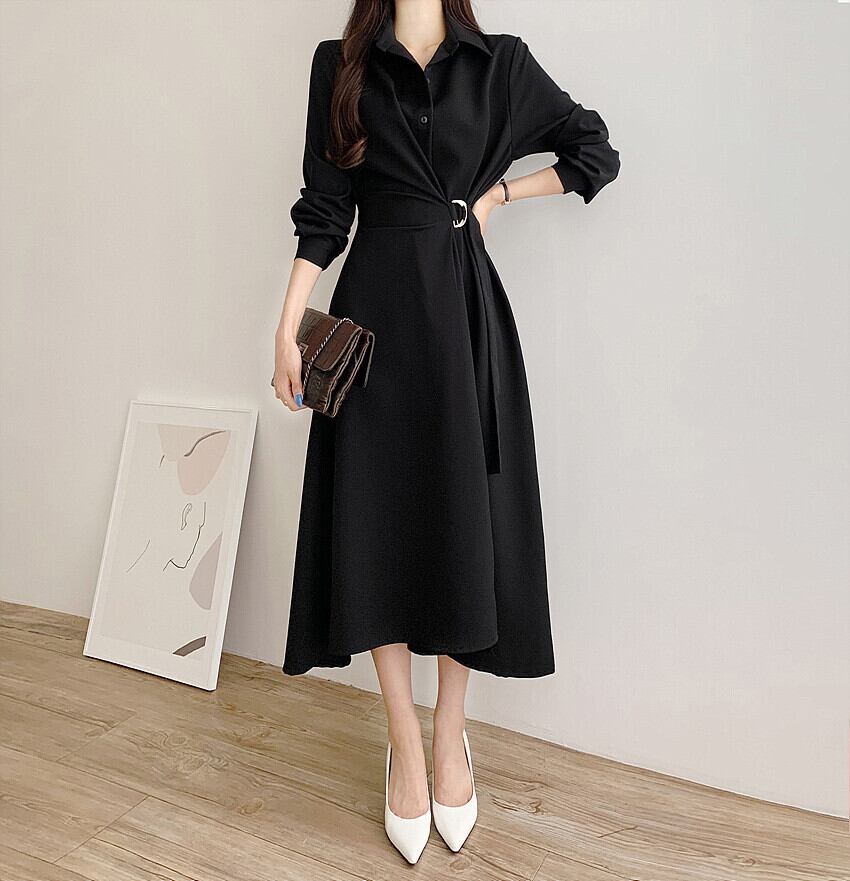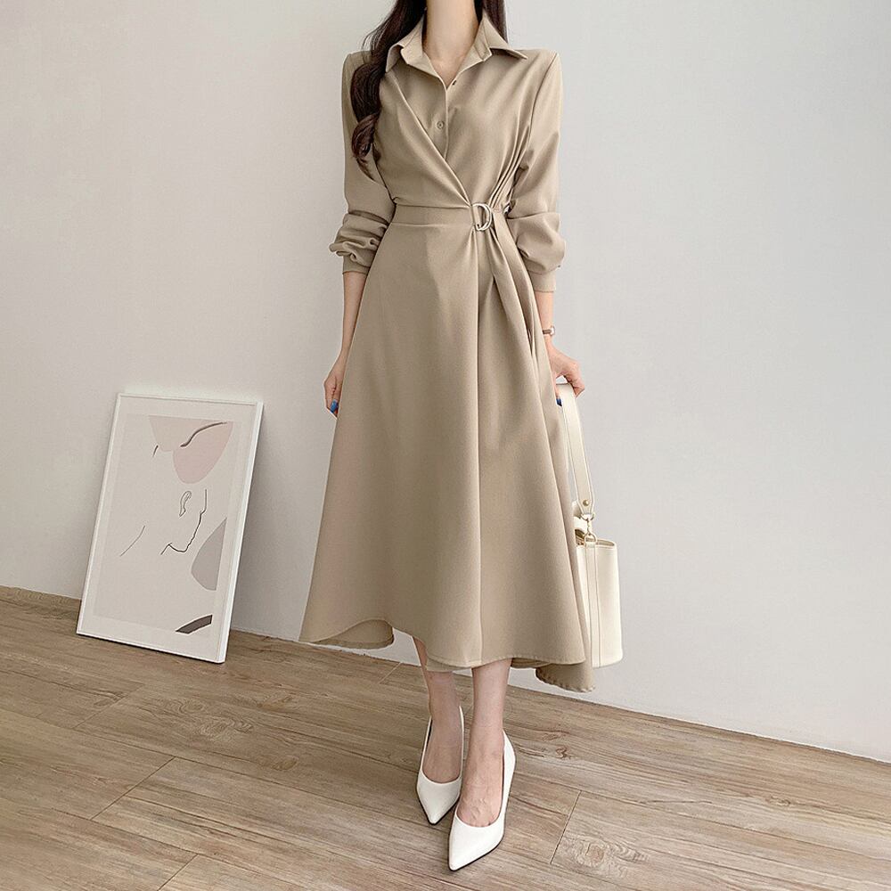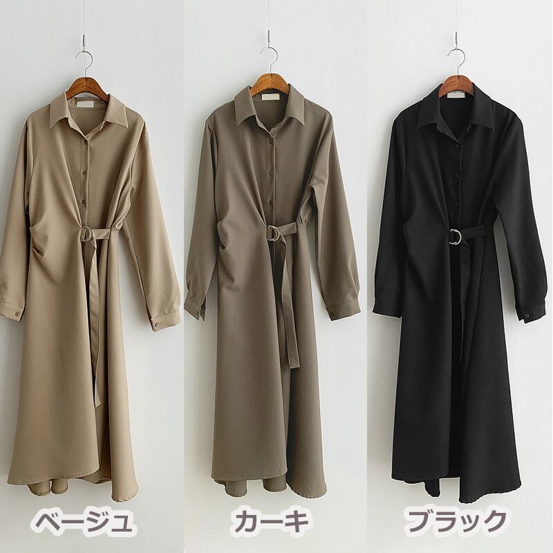 全3色 ワンピース ミモレ丈 カシュクール フィットアンドフレアワンピース 袖あり 長袖 襟付き シャツワンピース アシンメトリー 切り替えデザイン ベルト ウエストマーク 前開き ウエスト絞り 脇留めベルト ウエストマーク フレアスカート Aラインスカート 大人可愛い ラグジュアリー 無地 通勤 学生 通学 韓国系 美脚 フリーサイズ 黒 ブラック 茶色 ブラウン ベージュ カーキ
