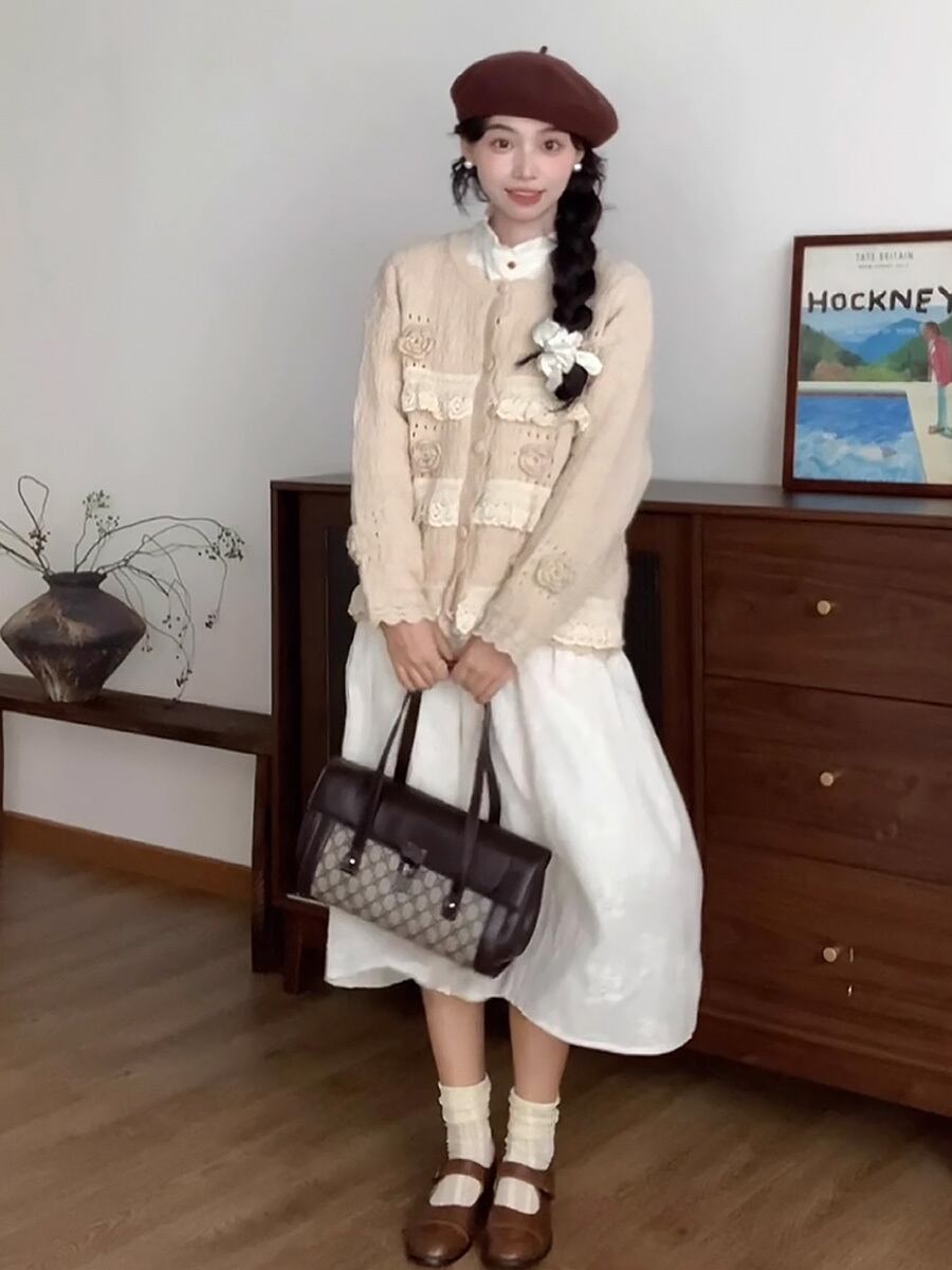 長袖ロング刺繍生地ワンピース ホワイト オフホワイト アイボリー アプリコット ハイウエスト切替え バルーン袖 刺繍生地 刺繍 レイヤードコーデ 重ね着 重ね着ワンピ かわいい 刺繍 レトロ風 ワンピース ハイウエスト 腰高 ミモレ 袖あり バルーン袖 ギャザー袖 切り替え 長袖 ボリューム袖 萌袖 体型カバー 大人可愛い ラブリー キュート ガーリー OL 学生 デート パーティー イベント リゾート 旅行 韓国系 オルチャン