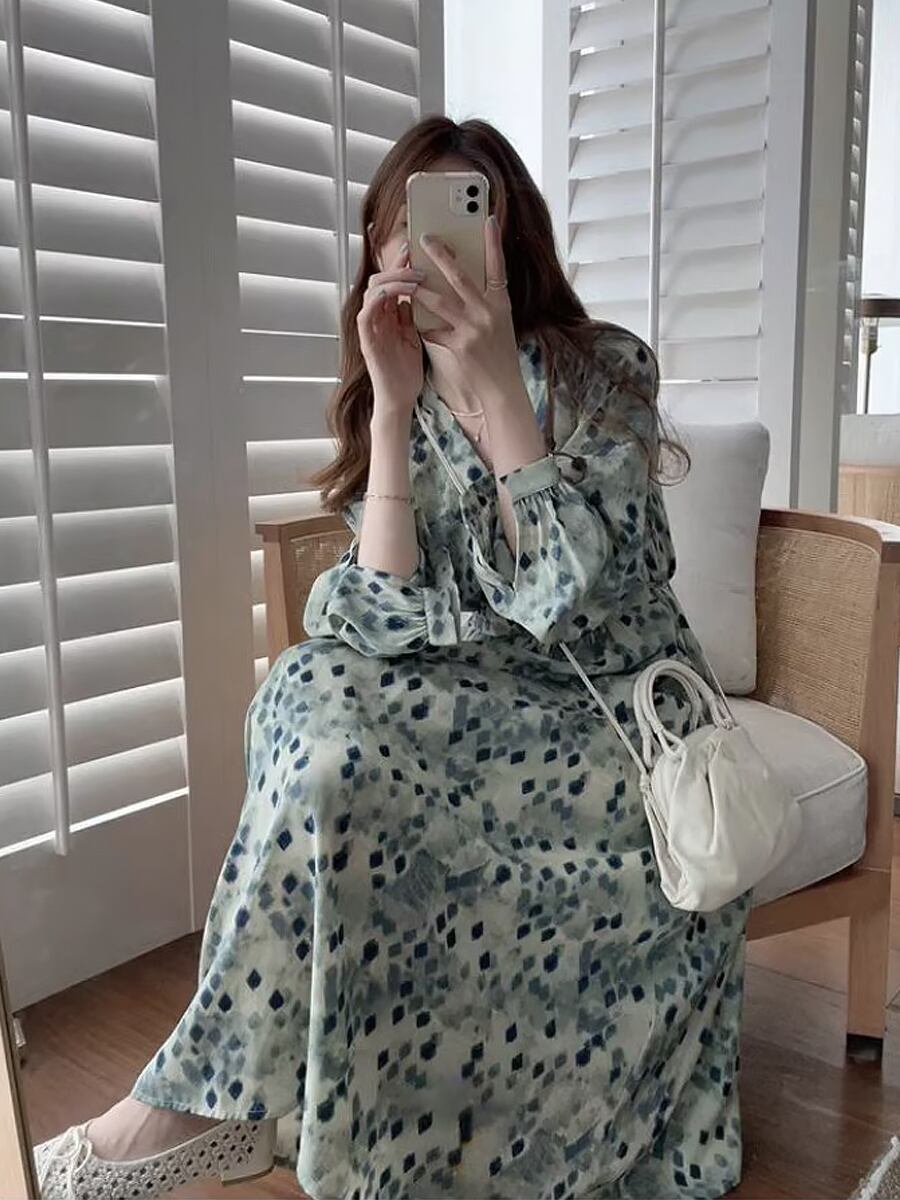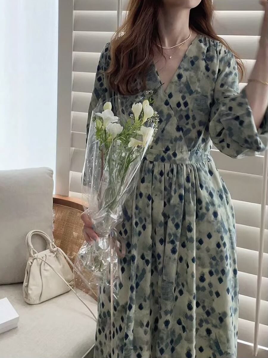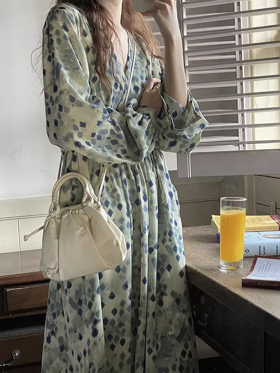 カシュクール風ダイヤ柄ロングワンピース ワンピース フレアワンピース 膝下 ミモレ ミモレ丈 ロング 袖あり 長袖 Aライン ウエストマーク ハイウエスト 腰高 韓国 大人可愛い おしゃれ 大人女子 ラブリー キュート ガーリー 透け感 主役級 存在感 花柄 春 夏 秋 10代 レディース ママ 学生 OL デート 女子会 通勤 通学 休日 イベント リゾート 旅行 ホテル コーデ モテ インスタ映え 韓国コーデ 緑 グリーン