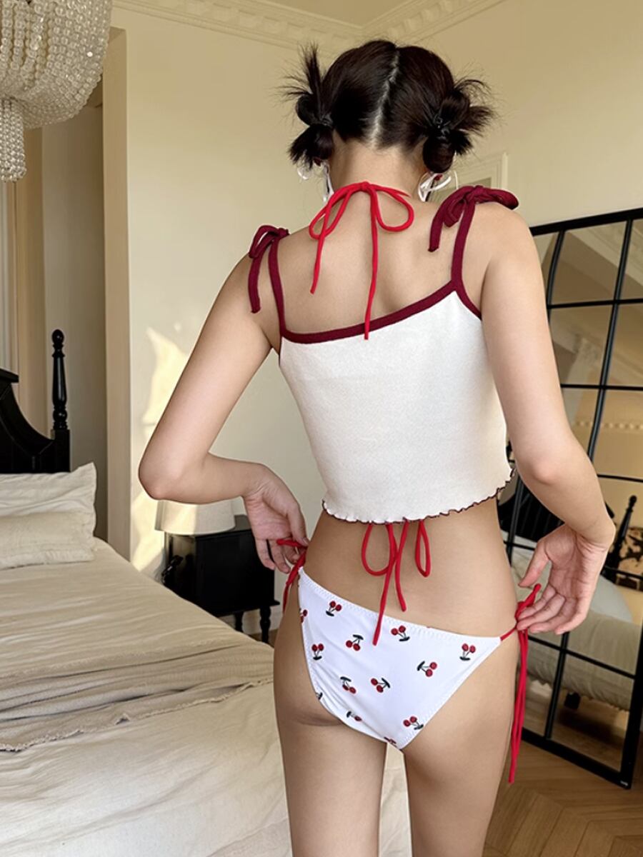 3点セット 水着 ビキニ チェリープリント紐ビキニ+キャミソール さくらんぼ チェロー ホルターネック レトロ タイサイドビキニ マイクロビキニ キャミソール付き ガーリー 原宿系 乙女系 レディース スイムウェア なつかしプリント パッド付き ワイヤーなし リボン バックリボン 体系カバー ガーリー 可愛い おしゃれ お洒落 女っぽ 個性的 レディース ホテル 温泉 海 ビーチ プール リゾート 旅行 韓国コーデ 韓国ファッション 赤 白 レッド ホワイト