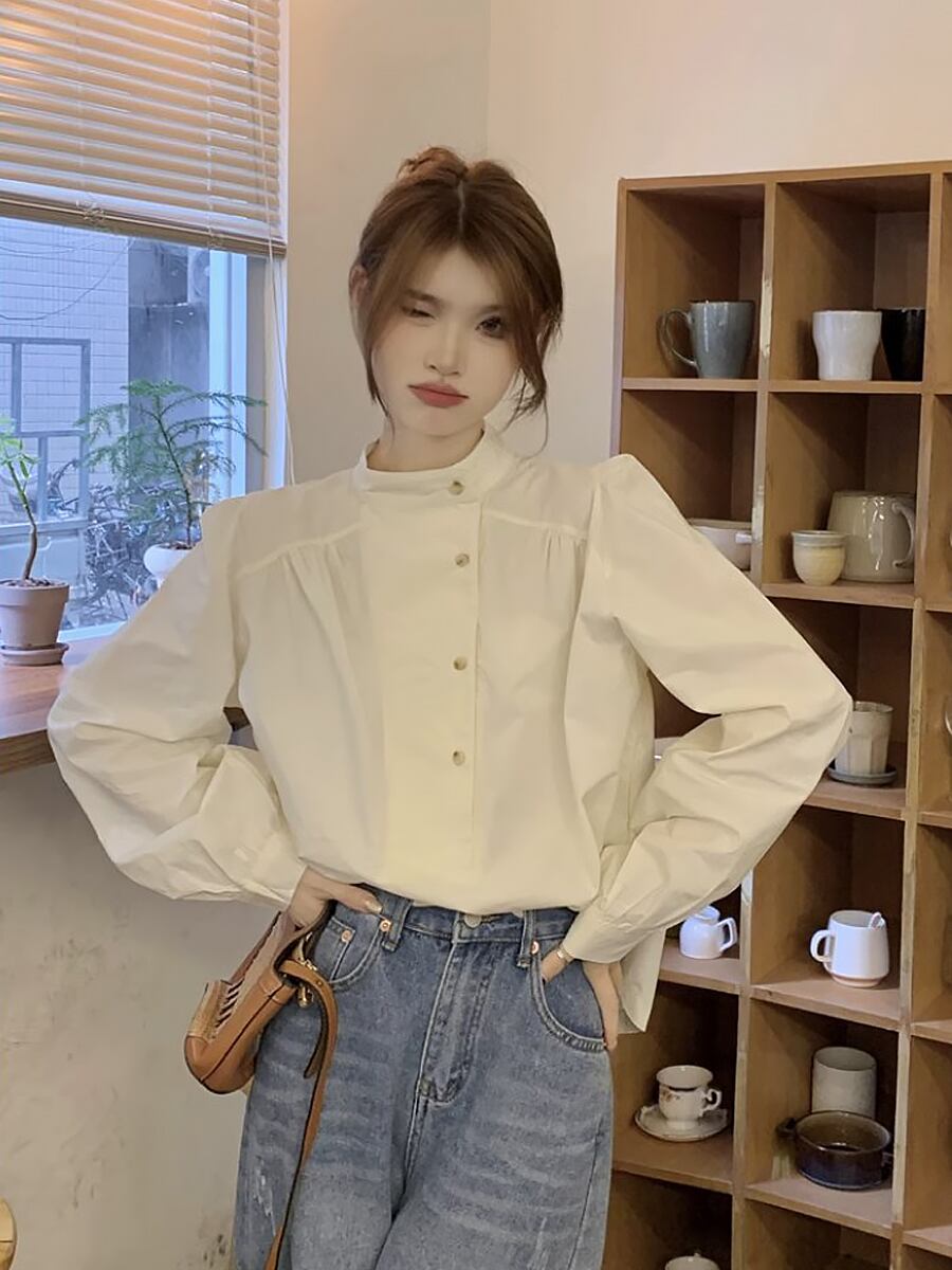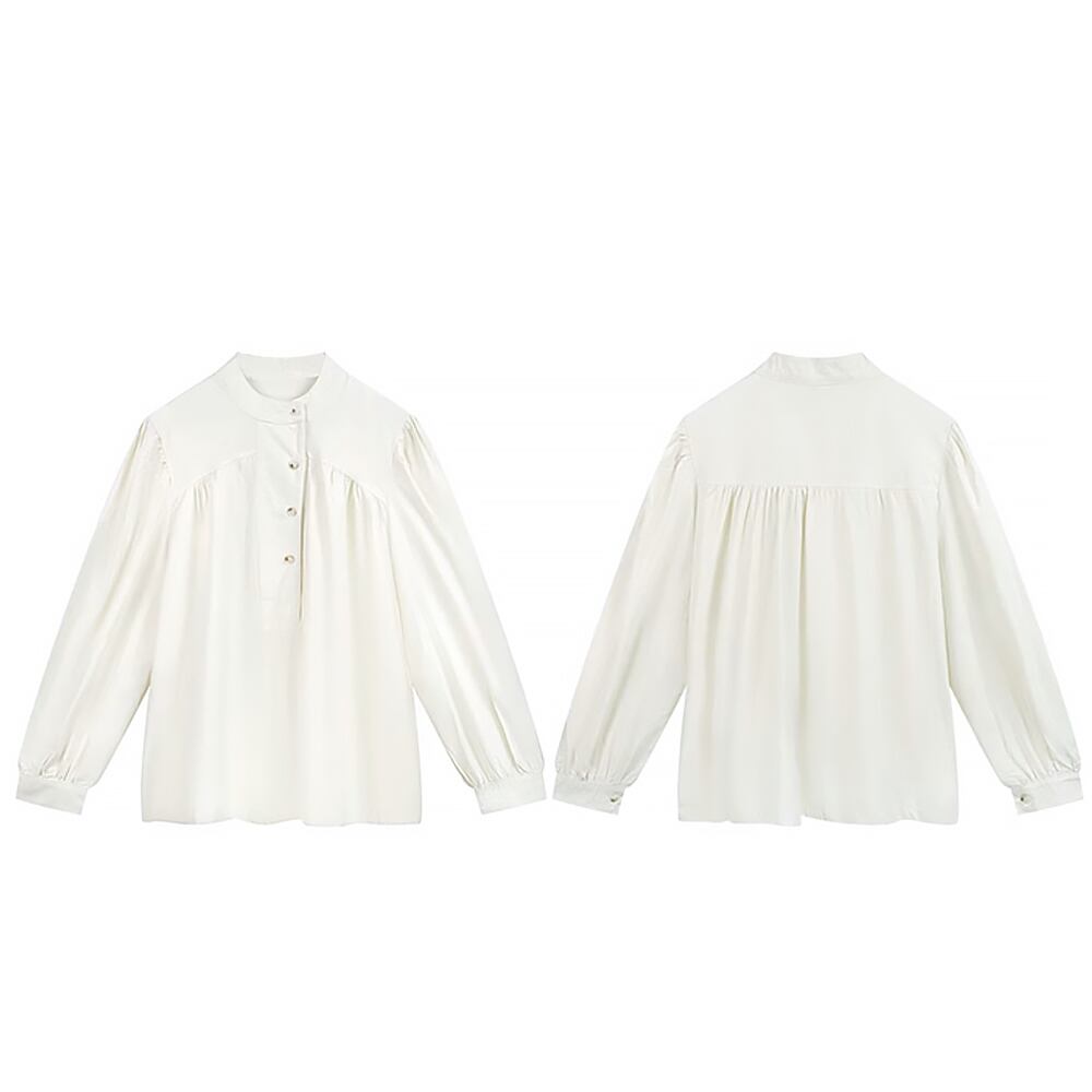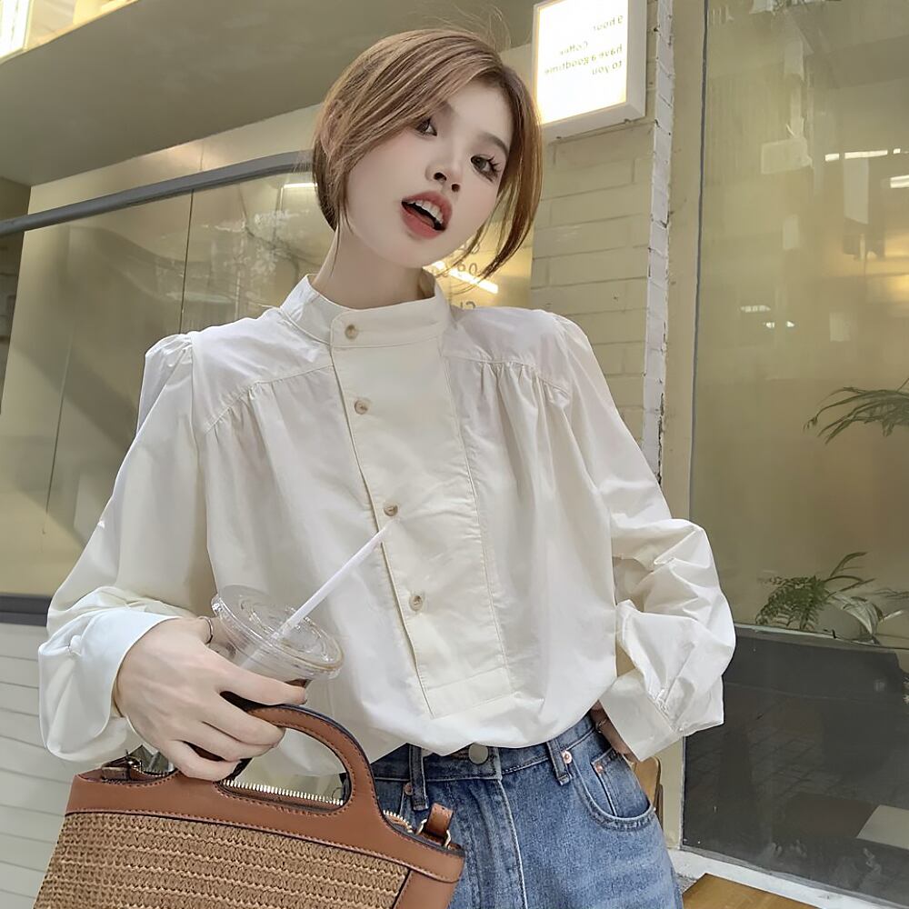 スタンドサイドカラーパフスリーブブラウス プルオーバー 袖あり 長袖 肩タック 生成り アプリコット オフホワイト アイボリー ナチュラル感 韓国ファッション 大人可愛い おしゃれ 大人女子 ラブリー キュート ガーリー 透け感 主役級 存在感 花柄 春 夏 秋 レディース ママ 学生 OL デート 女子会 通勤 通学 休日 イベント リゾート 旅行 ホテル コーデ モテ インスタ映え 韓国コーデ