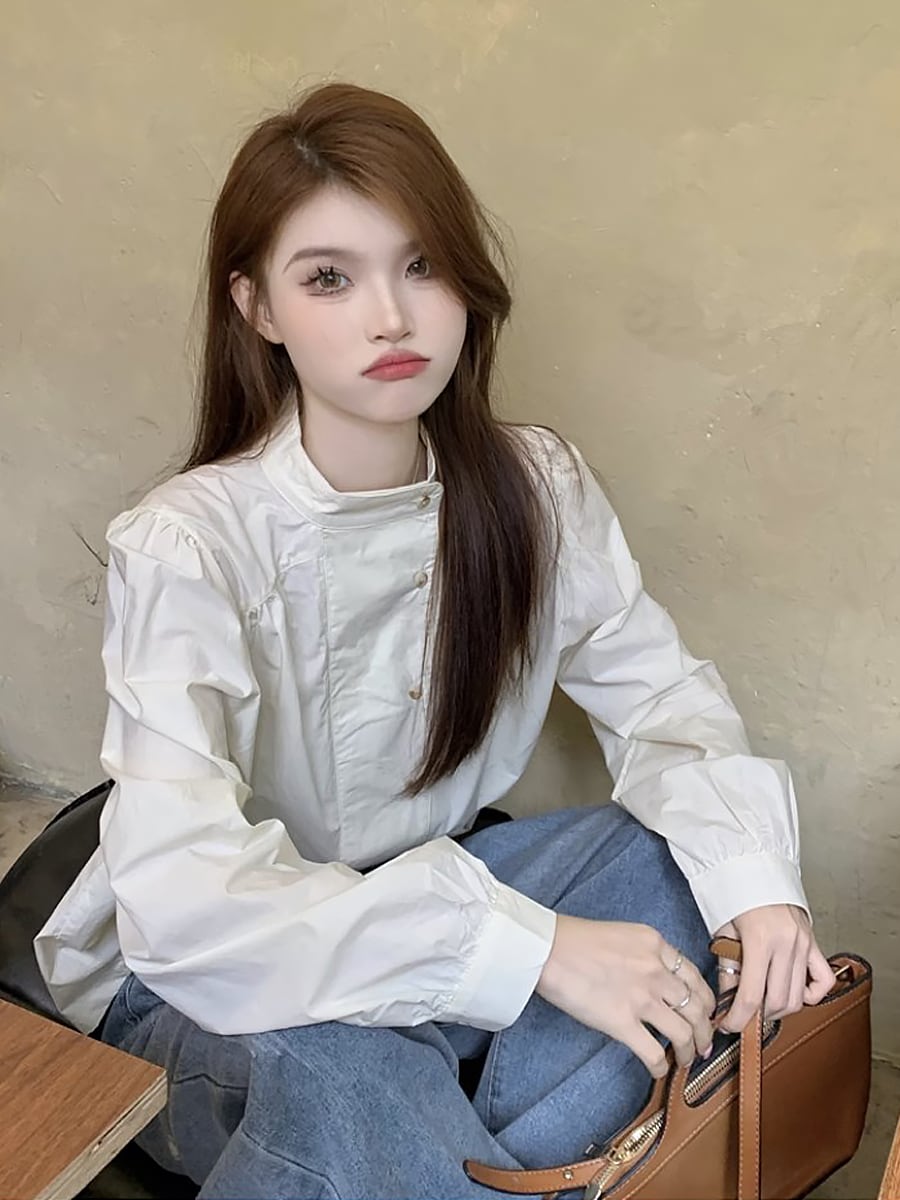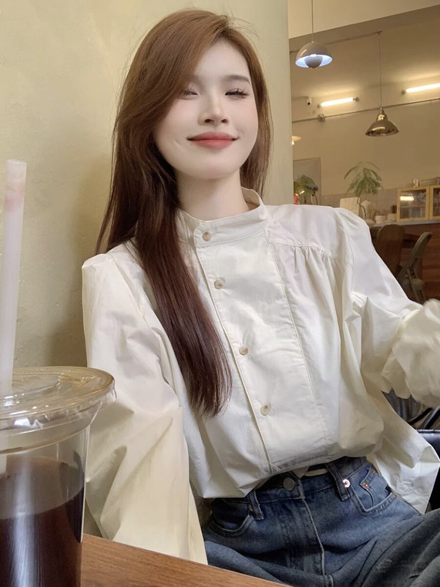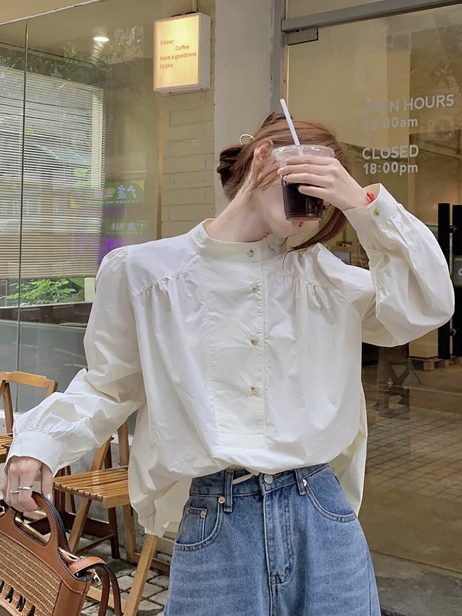 スタンドサイドカラーパフスリーブブラウス プルオーバー 袖あり 長袖 肩タック 生成り アプリコット オフホワイト アイボリー ナチュラル感 韓国ファッション 大人可愛い おしゃれ 大人女子 ラブリー キュート ガーリー 透け感 主役級 存在感 花柄 春 夏 秋 レディース ママ 学生 OL デート 女子会 通勤 通学 休日 イベント リゾート 旅行 ホテル コーデ モテ インスタ映え 韓国コーデ
