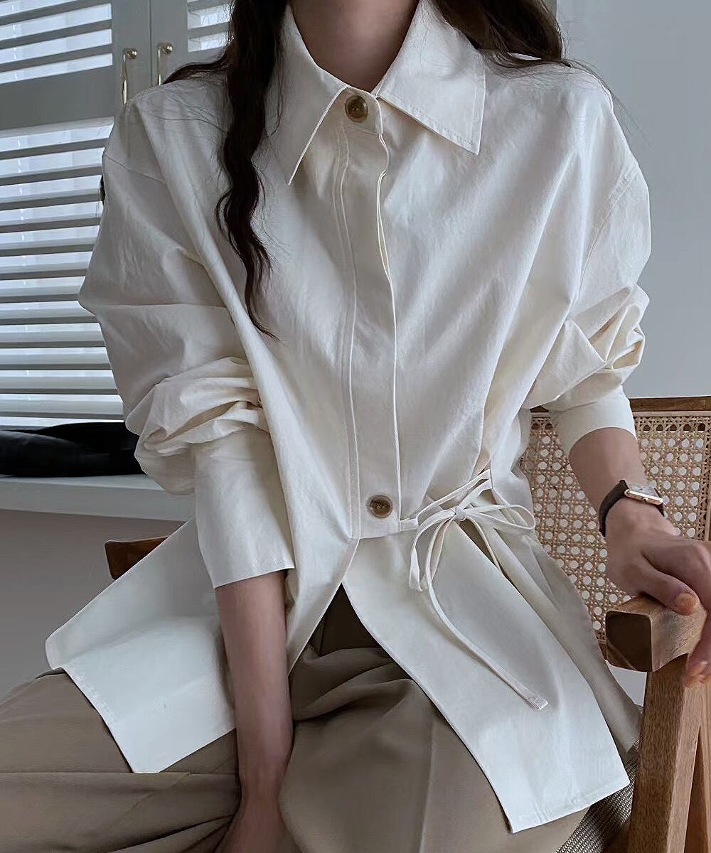 全2色 トップス 長袖シャツ サイドリボン かわいい 大人可愛い きれいめ ナチュラル シンプル カジュアル 大人 おしゃれ 大人女子 こなれ感 キュート 主役級 存在感 無地 春 秋 10代 20代 30代 レディース オフィス ビジネス OL 通勤 学生 通学 デート お出かけ 公園デビュー 女子会 休日 旅行 着回し 普段使い 重ね着 韓国 オルチャン 韓国コーデ スタイル フリーサイズ アイボリー ベージュ くすみカラー 大人カラー