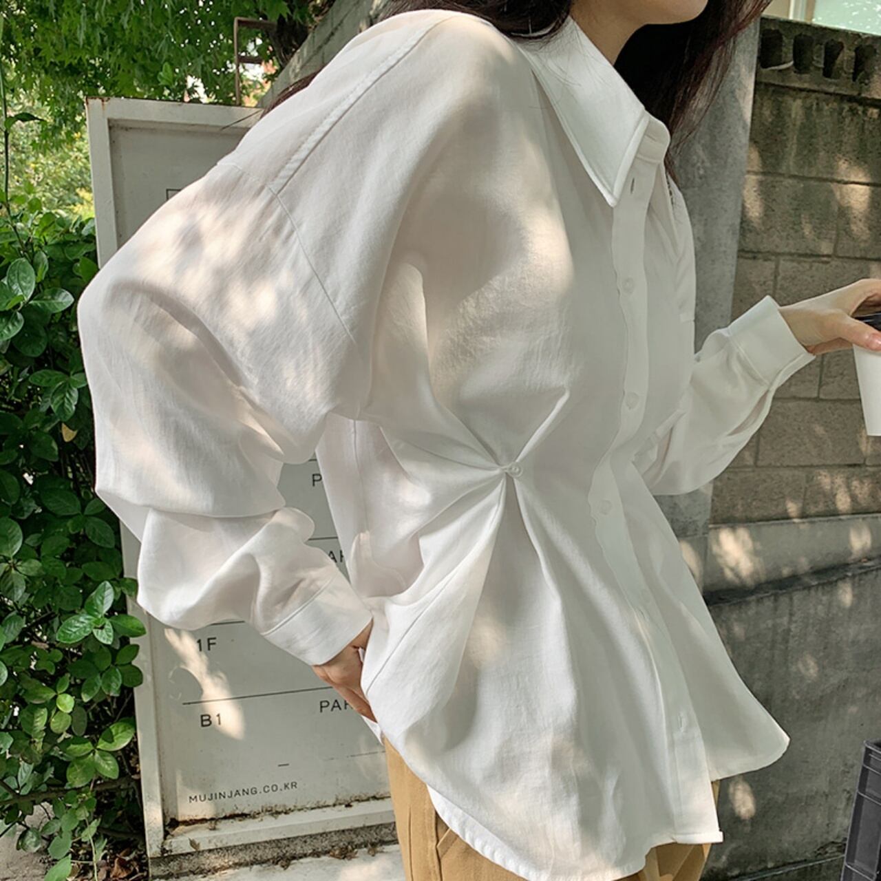 シャツ 白シャツ ウエストサイドボタン 袖あり 長袖 襟付き ウエストマーク 前開き 透け感 かわいい 大人可愛い きれいめ シンプル 大人 上品 おしゃれ 大人女子 こなれ感 ラフ キュート 主役級 存在感 フォーマル 抜け感 無地 春 秋 10代 20代 30代 レディース オフィス ビジネス OL 通勤 学生 通学 デート お出かけ 公園デビュー 女子会 休日 着回し 普段使い 重ね着 韓国 オルチャン 韓国コーデ スタイル フリーサイズ ホワイト モノトーン