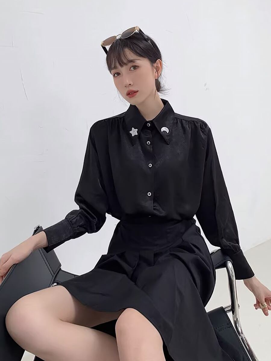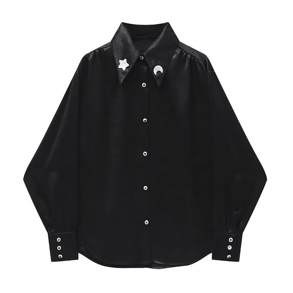星月ビジュー月ブラックシャツブラウス シャツ ムーン スター 星 月 三日月 ブラウス 袖あり 襟付き 長袖 前開き ゆったり オーバーサイズ 飾りボタン 袖口長め かわいい 大人可愛い きれいめ シンプル カジュアル 上品 おしゃれ お洒落 レトロ 大人女子 こなれ感 ラフ ラブリー キュート ガーリー 個性的 クール モード系 エレガント モダン 主役級 存在感 抜け感 韓国コーデ 韓国ファッション 黒 ブラック