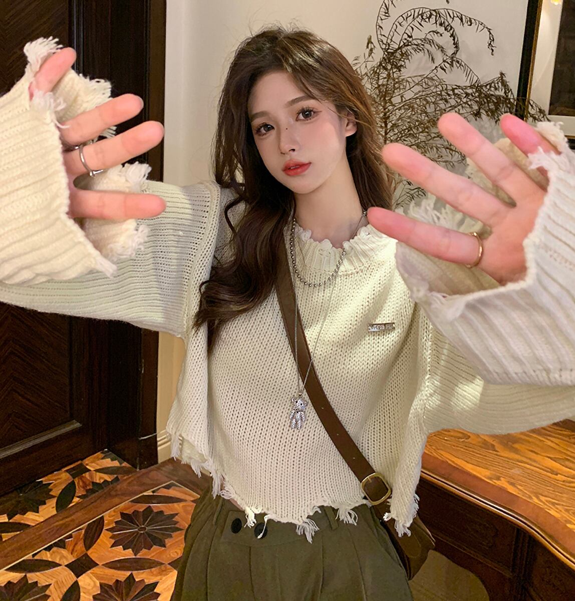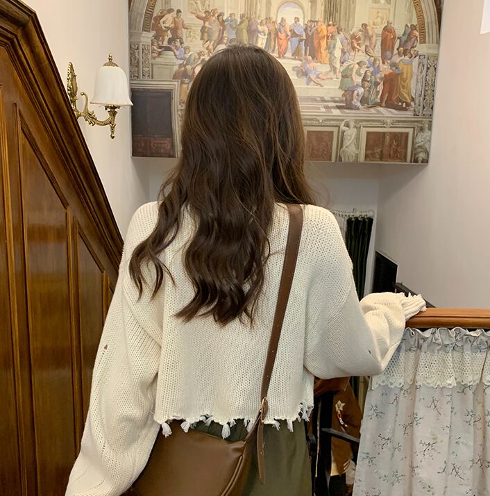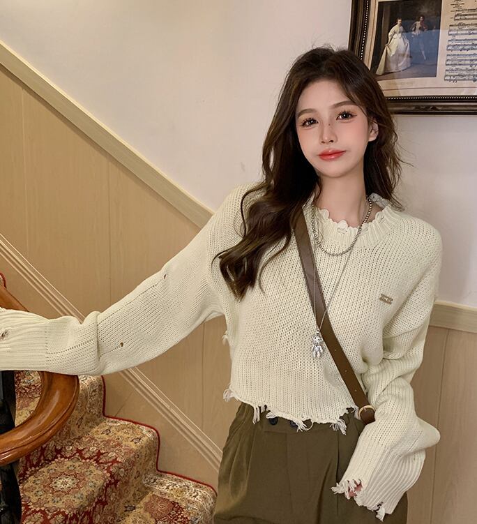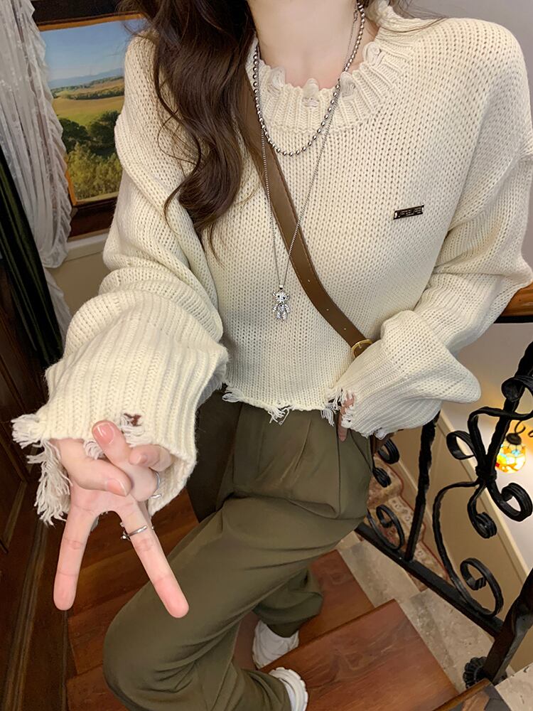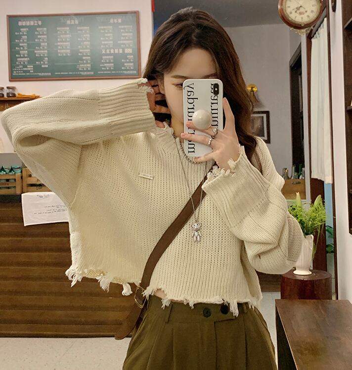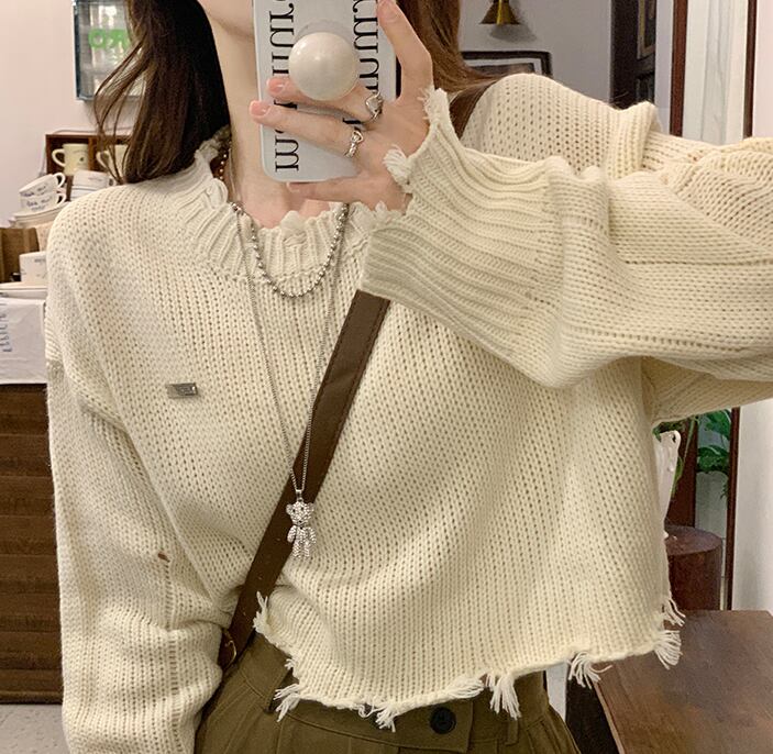 ダメージニット 長袖 クロップドニット ワイド スマート かわいい 大人可愛い きれいめ シンプル カジュアル 大人 おしゃれ お洒落 かっこいい レトロ 大人可愛い 大人女子 こなれ感 ラフ ラブリー キュート ガーリー ルーズ 個性的 ゆったり 重ね着コーデに レイヤードスタイルにおすすめ 韓国コーデ 韓国ファッション 韓国 オフホワイト アイボリー 薄ベージュ