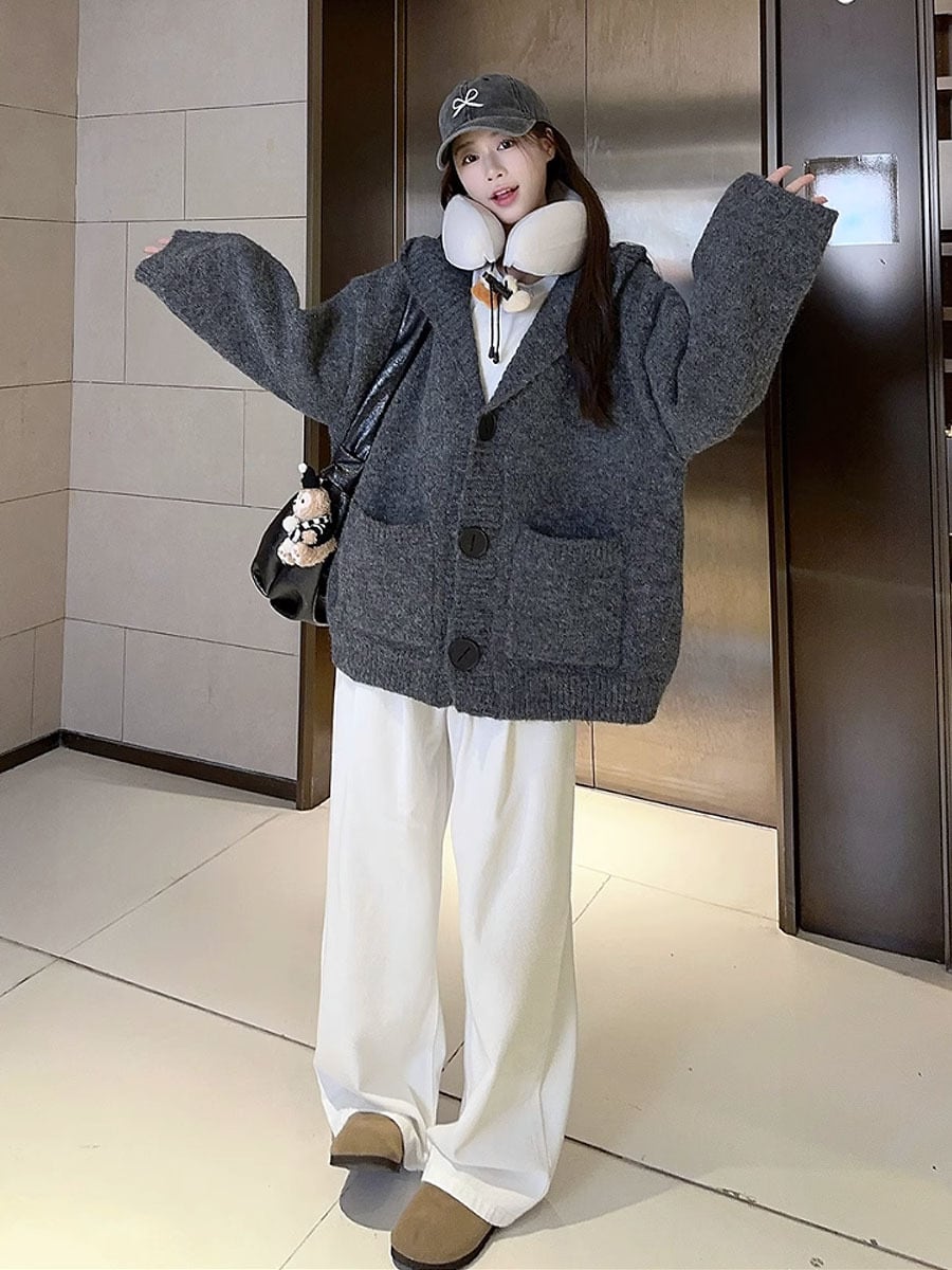 全3色 フード付きオーバーサイズカーディガン ゆったり 大きめ ざっくり 長袖カーディガン グレー ブラウン ベージュ 灰色 茶色 フード付き フード 大きめボタン 前ボタン カーディガン 毛糸 ゆったり ニット 襟なし 長袖 かわいい 大人可愛い ガーリー きれいめ シンプル カジュアル 大人 おしゃれ お洒落 レトロ 大人女子 こなれ感 ラフ キュート 春 秋 冬 レディース 通勤 通学 デート お出かけ 着回し 普段使い 重ね着 楽ちん 暖かい 韓国コーデ 韓国ファッション