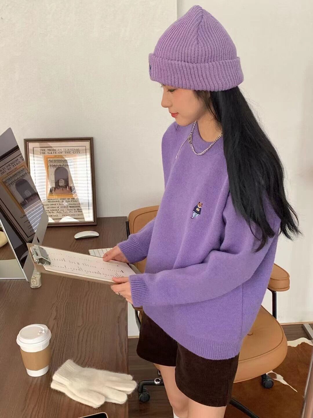 全5色 プルオーバーセーター トップス セーター 袖あり 長袖 ラウンドネック ニット 大人可愛い カジュアル おしゃれ お洒落 大人女子 こなれ感 くま 熊 ボーイッシュ ルーズ シンプル ラブリー キュート ガーリー とろみ感 抜け感 厚手 もこもこ ふわふわ 春 秋 冬 10代 20代 30代 40代 50代 レディース 女性用 学生 通学 通勤 デート お出かけ 公園デビュー 着回し 普段使い お揃い 韓国コーデ 韓国 トレンド ホワイト ブラウン ピンク ネイビー パープル