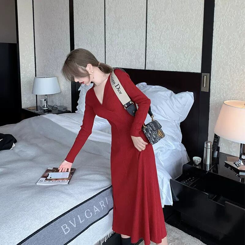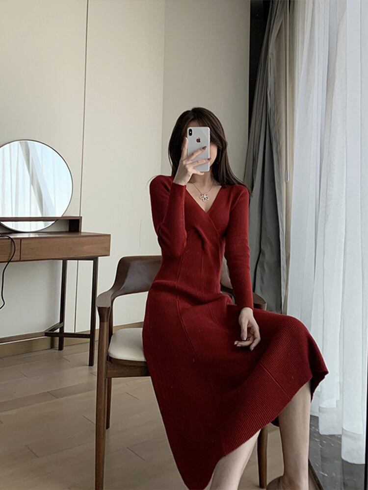 全3色 ニットワンピース カシュクールワンピース ミモレ ロング 長袖 フロントクロス Vネック スリム ハイウエスト ウエストマーク もこもこ ふわふわ リブ 伸縮性 大人っぽい 厚手 大人女子 大人可愛い こなれ感 おしゃれ ラフ ルーズ クール エレガント モダン 主役級 存在感 無地 10代 20代 30代 40代 50代 春 秋 冬 オフィス OL 韓国 韓国コーデ お出かけ デート 着回し 普段使い ホワイト レッド ブラック