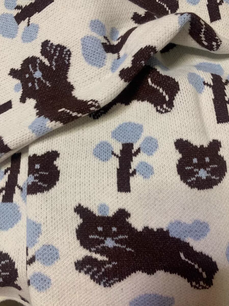 猫の編み込みが可愛いニットの前ボタンのロングベストです。