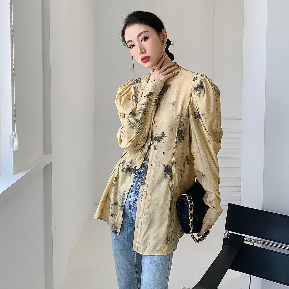 レディース シャツブラウス ループボタン サイドシャーリング ループボタン アースカラー バルーンスリーブ パフスリーブ バブルスリーブ 前開き ビンテージ風 ヴィンテージ レトロ アンティーク ノスタルジー 立て襟 スタンドカラー 墨絵風 上品 大人可愛い きれいめ きちんと感 かっこいい 大人女子 こなれ感 ラフ キュート ガーリー 個性的 レディース 学生 通学 デート お出かけ 旅行 体系カバー 韓国コーデ 韓国ファッション