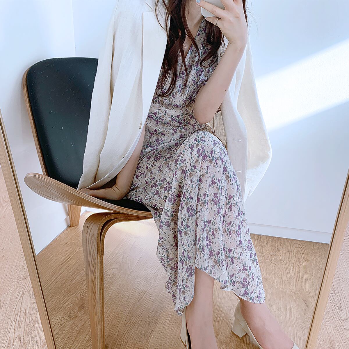 パフスリーブが目を惹くエレガントな花柄ワンピース。