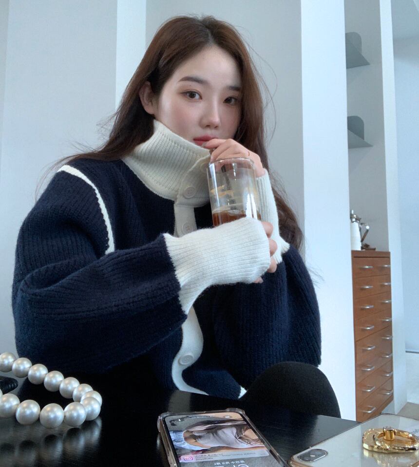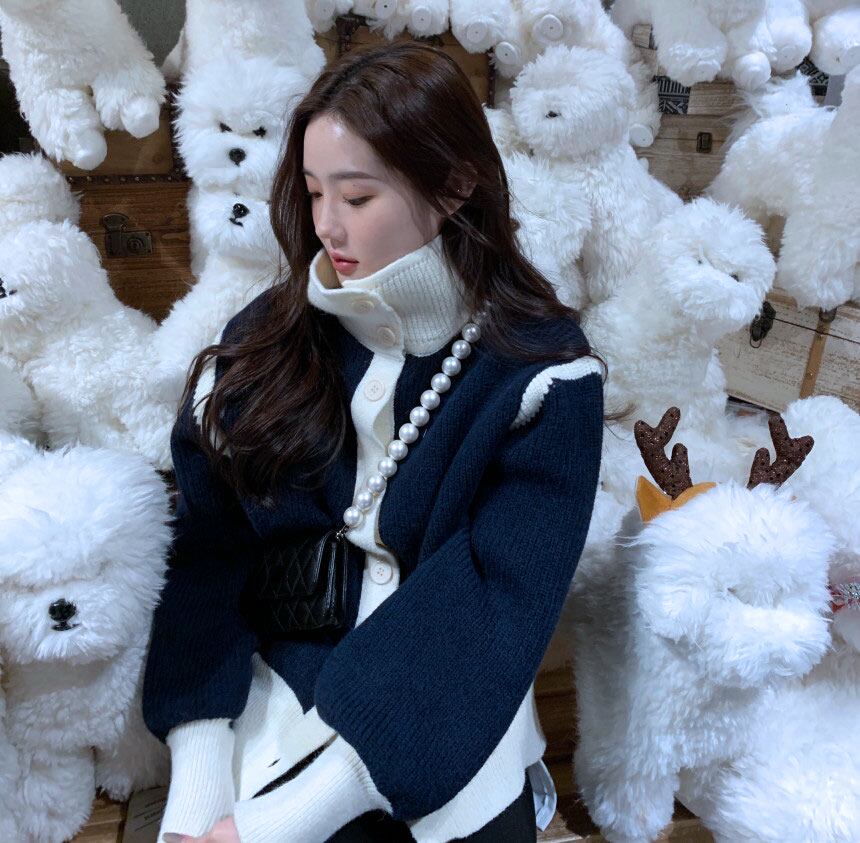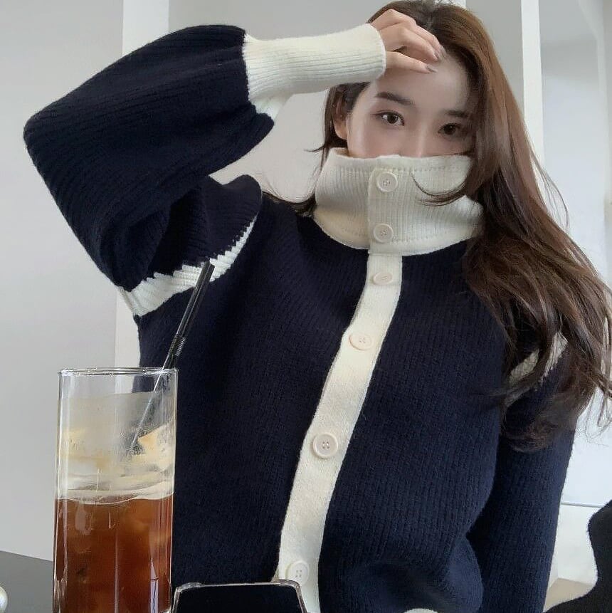 バイカラーハイネックニットカーディガン ツートンカラー かわいい 大人可愛い きれいめ シンプル カジュアル シングルボタン 袖口長め ロングニッテッドカフス 大人 上品 おしゃれ お洒落 かっこいい レトロ アジアン エスニック エキゾチック 大人可愛い 大人女子 こなれ感 ラフ ラブリー キュート 旅行 お出かけ 韓国コーデ 韓国ファッション フリーサイズ ディープブルー 濃紺 白 ダークブルー
