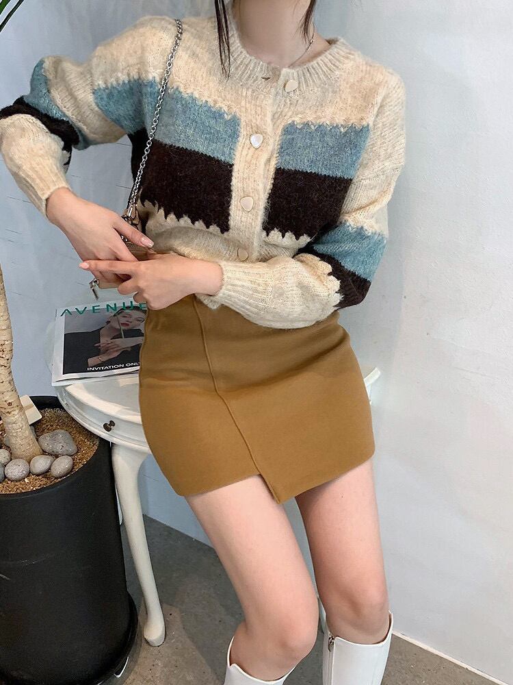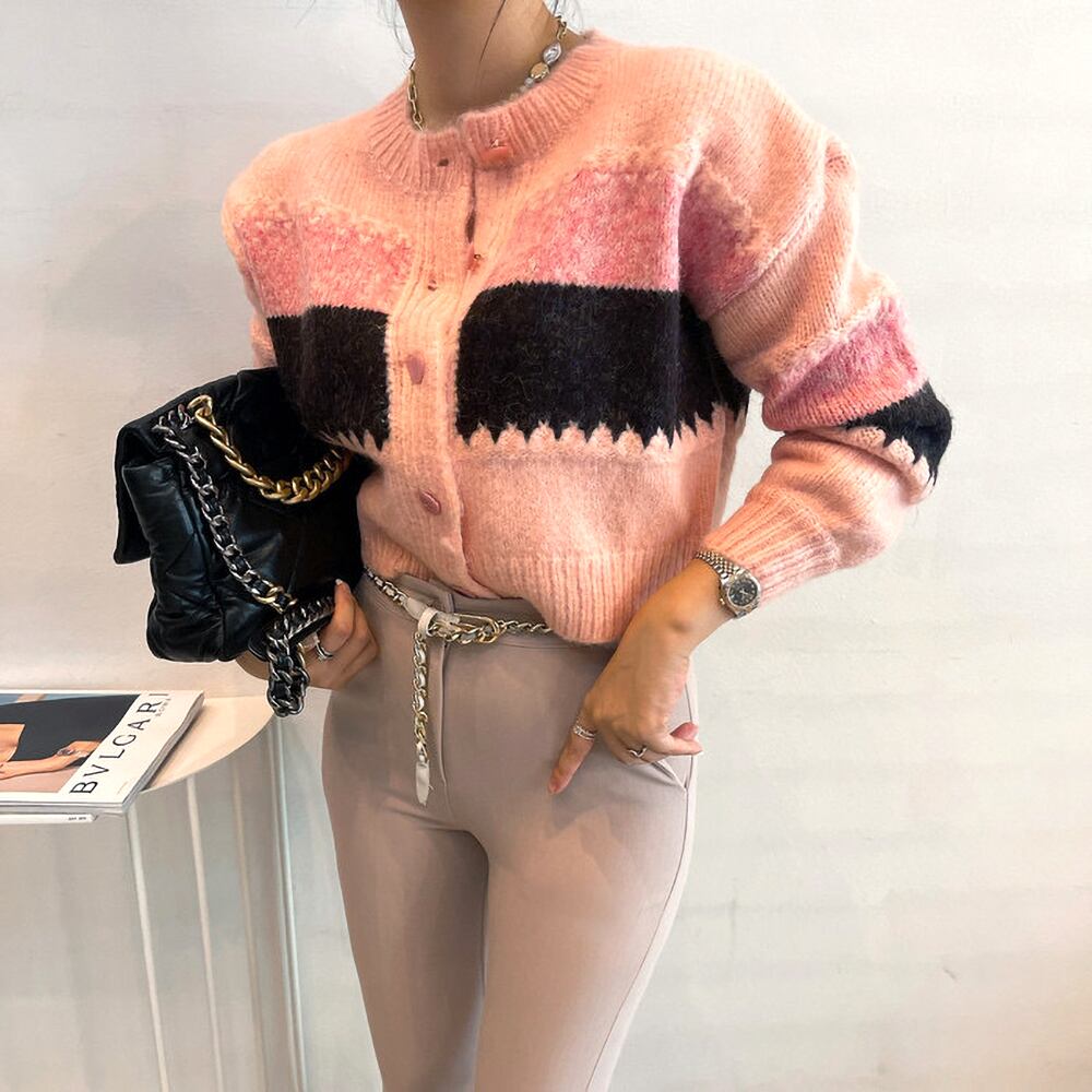 全4色 トリコロールカラー カーディガン ストライプ ブロッキングパターン ラウンドネック 襟なし かわいい 大人可愛い きれいめ シンプル カジュアル 大人 上品 おしゃれ お洒落 かっこいい レトロ 大人可愛い 大人女子 こなれ感 ラフ ラブリー キュート ガーリー ルーズ 個性的 主役級 存在感 クロップド丈 あったか 韓国 韓国コーデ 韓国ファッション グレー ネイビー ピンク ベージュ フリーサイズ