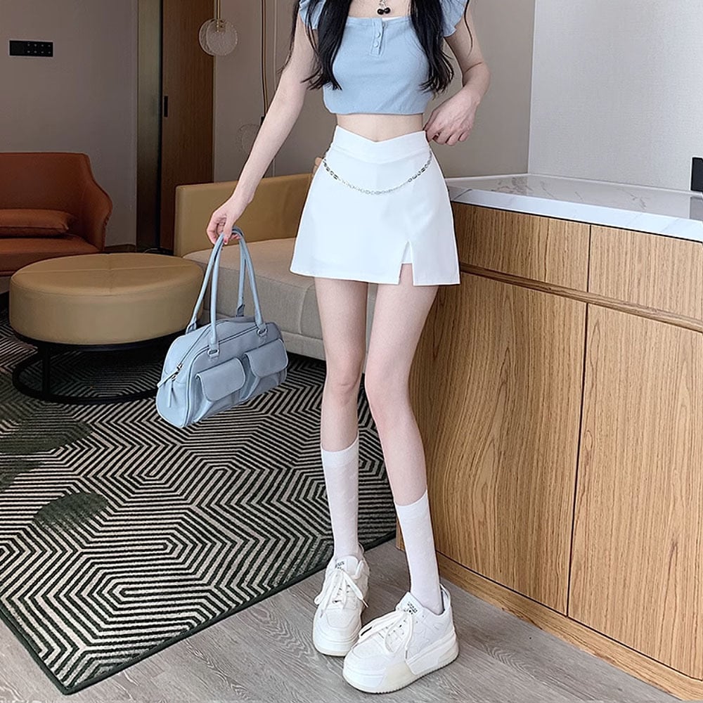 全2色 チェーンベルト付きV字ウエストミニスカート 飾り付き インナーパンツ付き ペチパンツ スリット ウエストチェーン チェーン 黒 白 ブラック ホワイト 春夏 サマー チェーンベルト きちんと感 かわいい 大人可愛い きれいめ シンプル カジュアル 大人 おしゃれ お洒落 かっこいい 大人可愛い 大人女子 こなれ感 ラフ ガーリー 個性的 レディース 学生 通学 デート お出かけ 公園デビュー 女子会 お泊まり 休日 運動 リゾート 旅行 海 プール 韓国コーデ 韓国ファッション