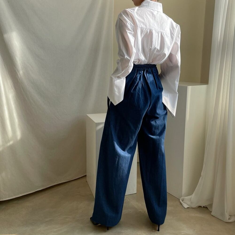 個性的な前たての切り替えと大きくひらいた袖口が特徴です。
