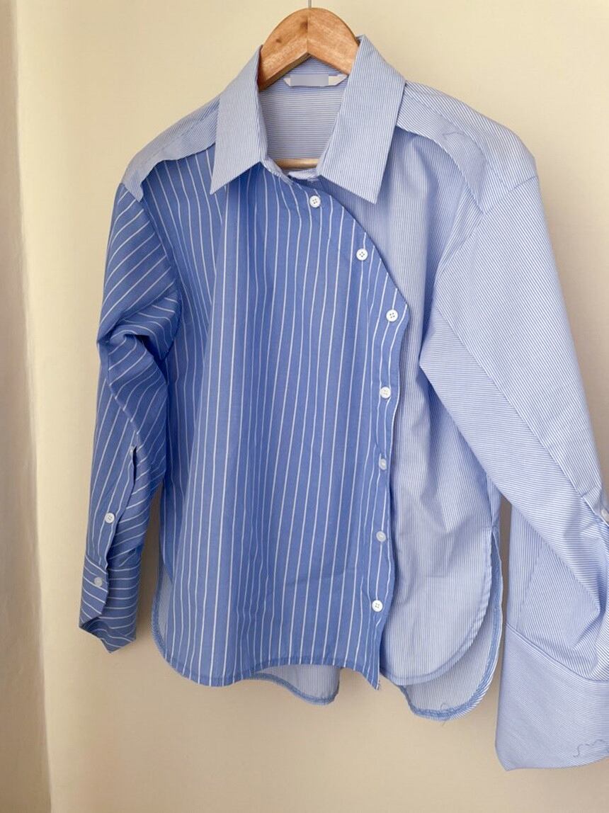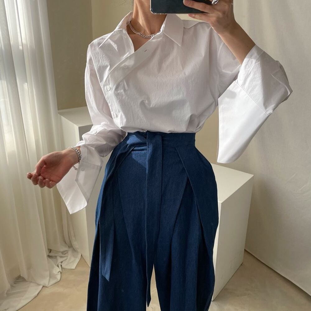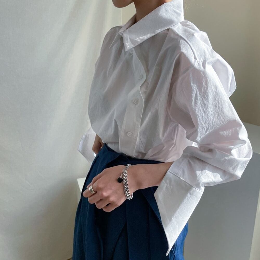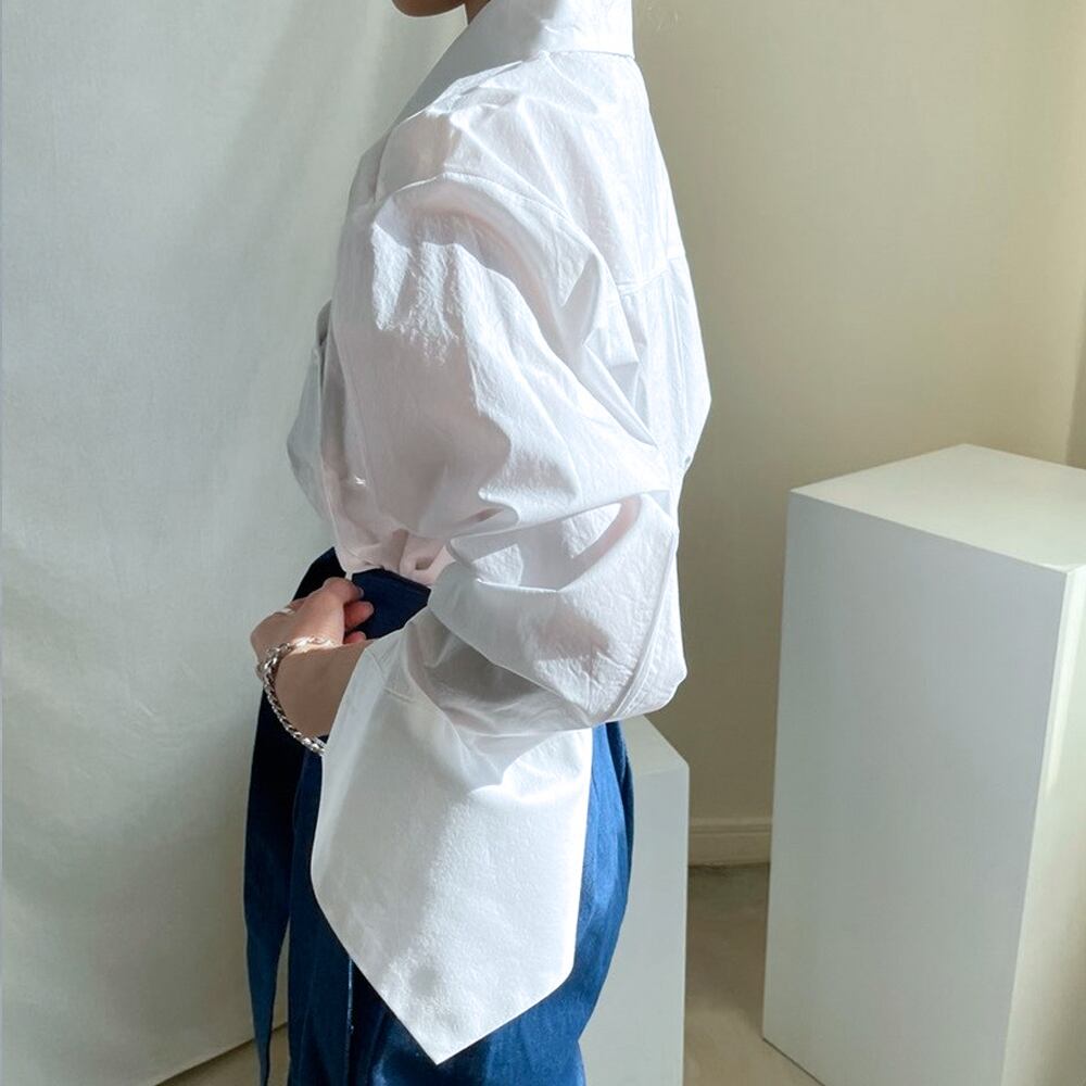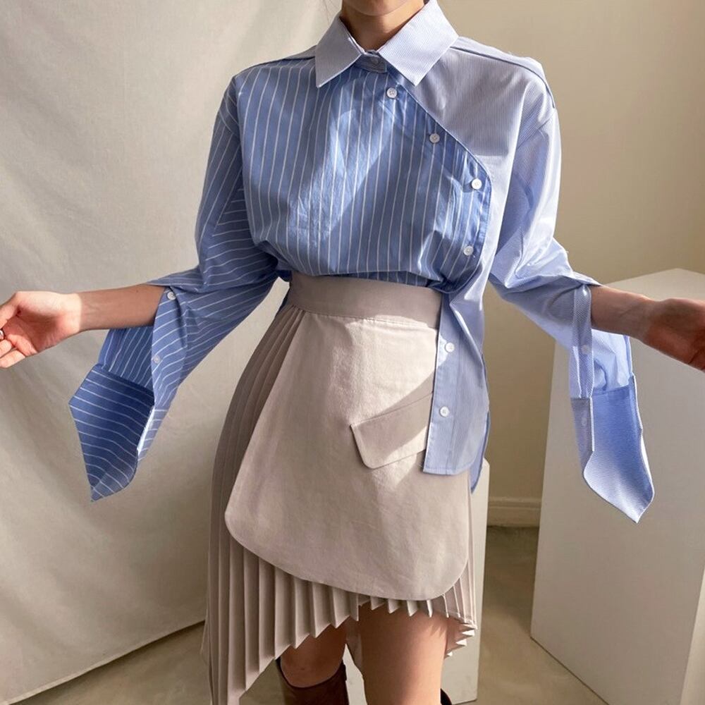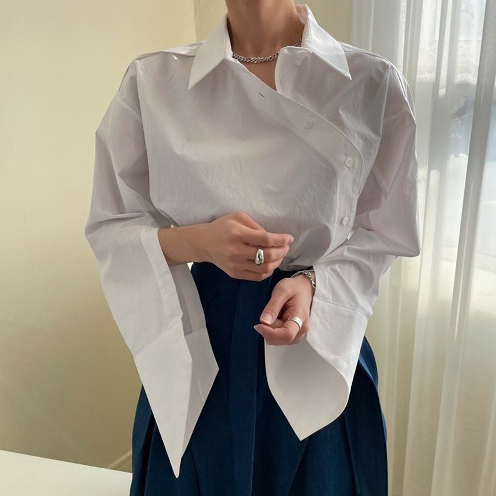 全2色 デザインスリーブシャツ ワイドラペル スリットスリーブ フレアスリーブ 斜め切り替えボタン 襟付き 変形袖 大人可愛い きれいめ カジュアル 大人 おしゃれ お洒落 かっこいい エキゾチック 大人可愛い 大人女子 こなれ感 ラフ ラブリー 個性的 レディース 通勤 学生 通学 デート お出かけ 公園デビュー 女子会 お泊まり 休日 リゾート 旅行 ホワイト 白 ブルー ストライプ 韓国コーデ 韓国ファッション フリーサイズ