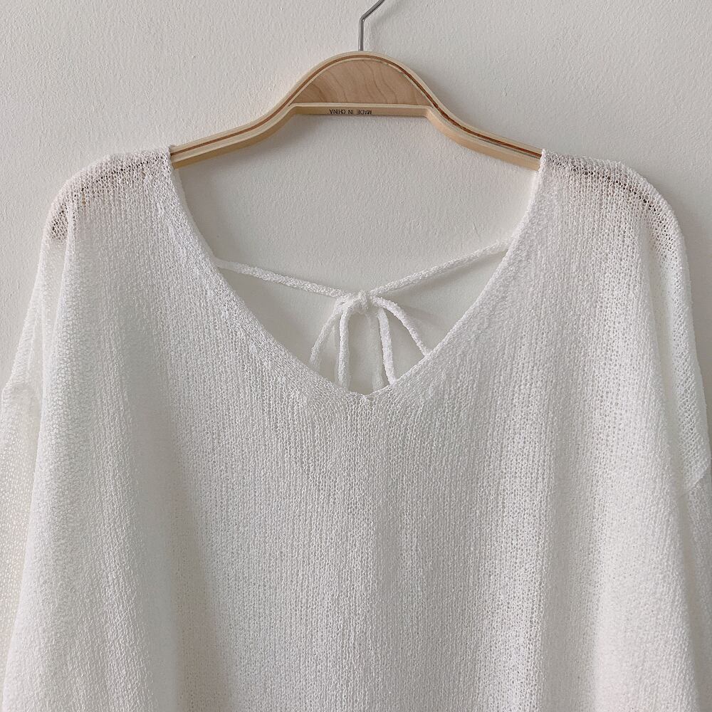 全2色 ルーズニット バックカット シアー トップス バックリボン Vネック 大人可愛い 薄手ニット 春ニット 夏ニット きれいめ シンプル カジュアル 大人 上品 おしゃれ お洒落 かっこいい 大人可愛い 大人女子 こなれ感 ラフ ラブリー キュート ガーリー 個性的 レディース ビジネス OL 通勤 学生 通学 デート お出かけ 公園デビュー 女子会 お泊まり 休日 リゾート 旅行 海 プール ホテル ガーデン レストラン 韓国ファッション 韓国コーデ 韓国 黒 白