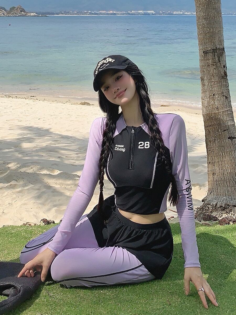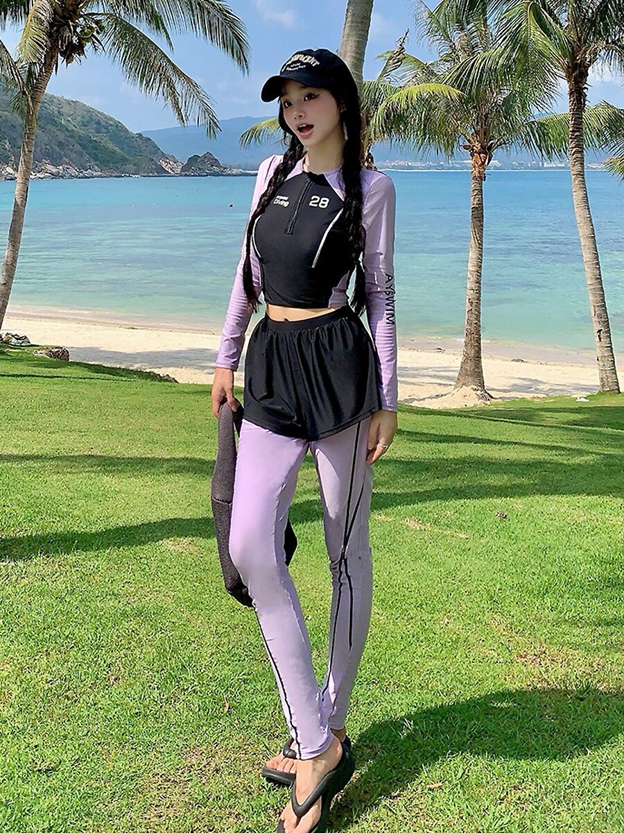 4点セット水着 長袖トップス+ボトムパンツ+ショートパンツ+ ロングパンツ スポーティセパレート水着 ビキニ セパレート 長袖 猛暑対策 酷暑対策 ラッシュガード水着 ショートパンツ フレアパンツ フィットネス ラベンダー 紫 黒 ブラック 二の腕カバー 体型カバー スポーティ 水遊び きれいめ フェミニン かわいい パッド付き ワイヤーなし 伸縮性 セット かわいい 大人可愛い きれいめ セクシー おしゃれ スタイリッシュ 美脚 脚長 韓国コーデ 韓国ファション
