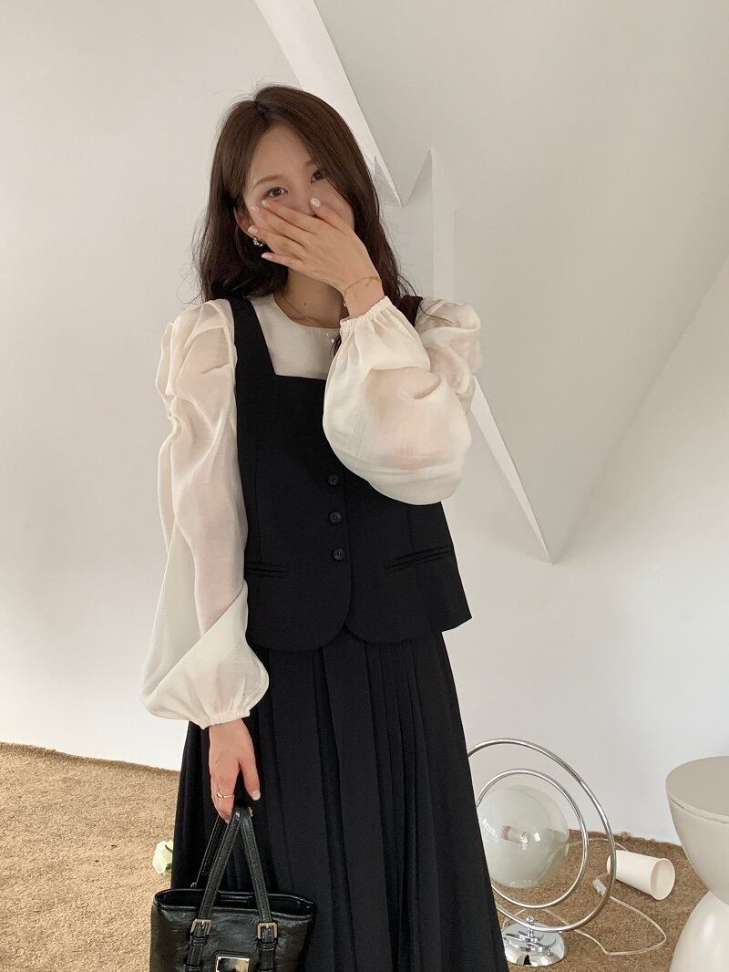 全2色 2点セット ベスト+プリーツスカート スカート ボトムス セットアップ ベスト プリーツスカート ミモレ ミモレ丈 袖なし スクエアネック 襟なし 上下セット かわいい 大人可愛い きれいめ シンプル おしゃれ レトロ こなれ感 クール モード系 モダン 主役級 存在感 フォーマル 無地 入学式 入園式 卒業式 卒園式 謝恩会 10代 20代 30代 40代 50代 レディース 女性用 ママ フリーサイズ ワンサイズ ホワイト ブラック ベージュ 韓国