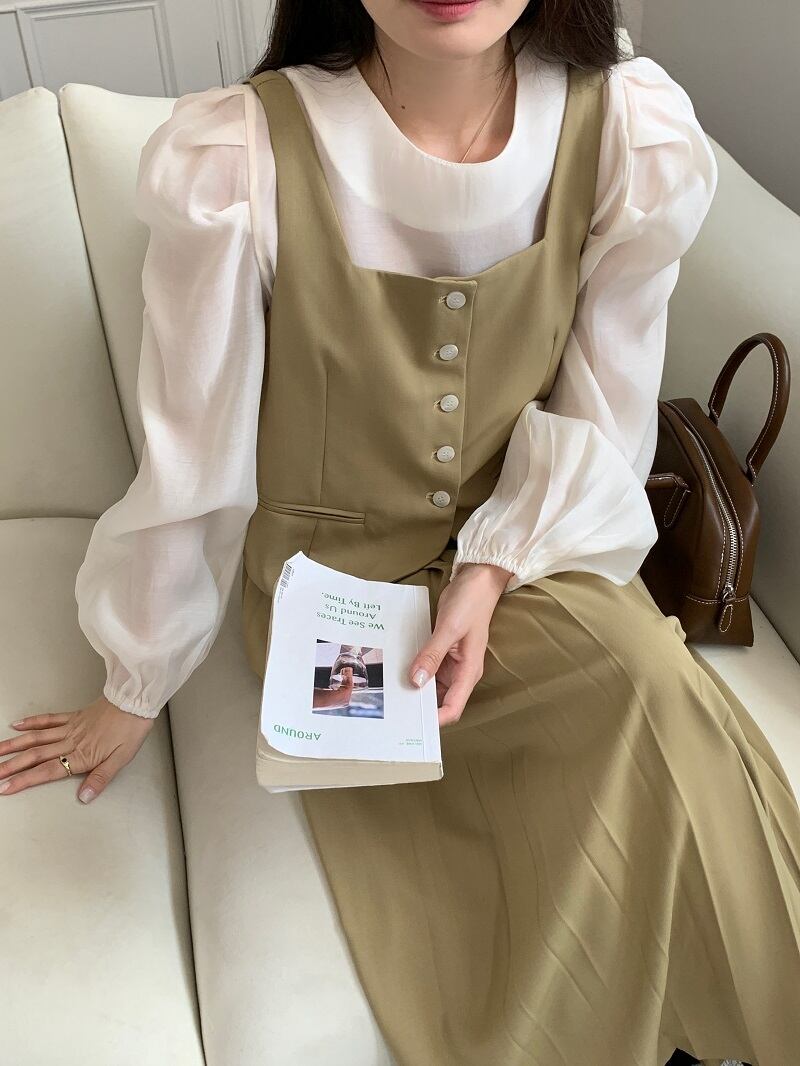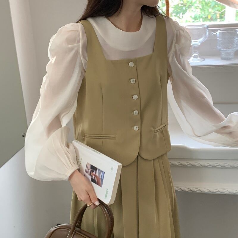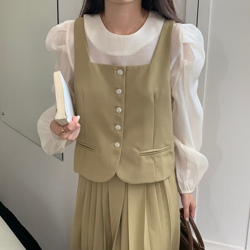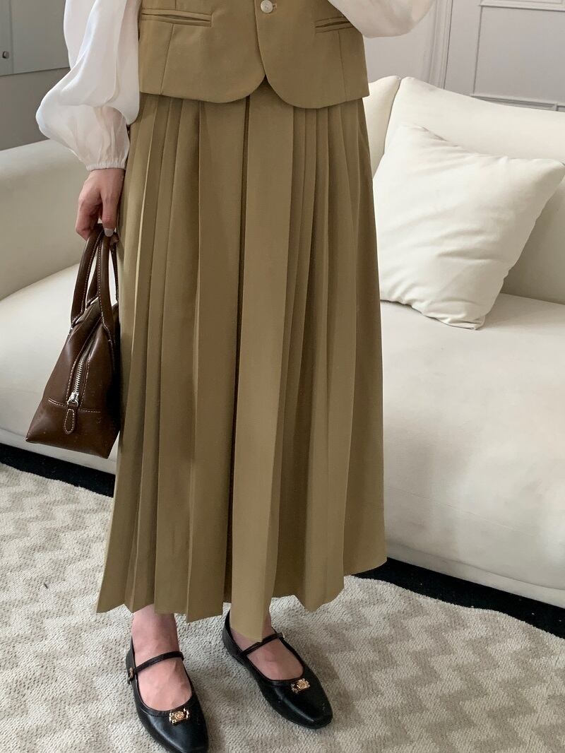 スクエアネックのシンプルなベストとプリーツスカートのセットアップ。