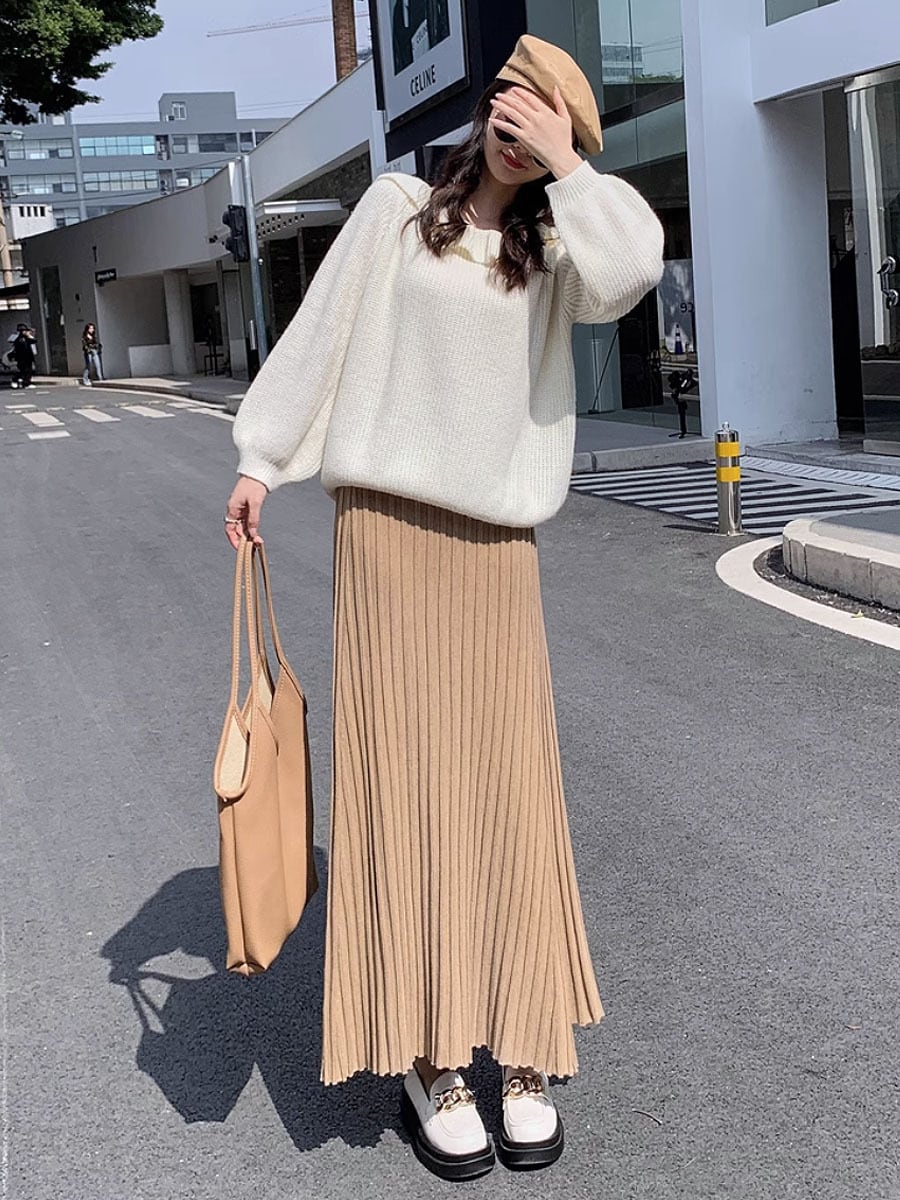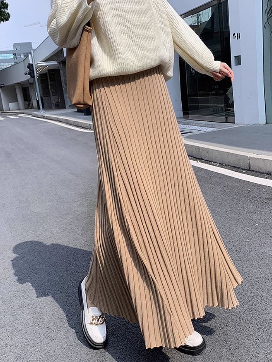 全4色 プリーツロングスカート マキシ マキシ丈 フェミニン アンクル丈 プリーツスカート 秋冬 フレア Aライン プリーツ ハイウエスト ウエストゴム 伸縮性あり 伸び縮み のびのび 楽ちん 大人可愛い きれいめ シンプル 大人 上品 おしゃれ お洒落 大人女子 クール エレガント 無地 レディース 通勤 学生 通学 デート お出かけ 女子会 休日 着回し 普段使い 楽ちん モテ 美脚 脚長 韓国コーデ 黒 白 ブラック オフホワイト カーキ ベージュ グレー 灰色