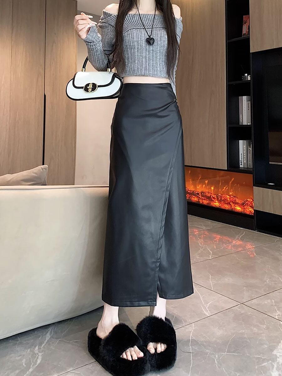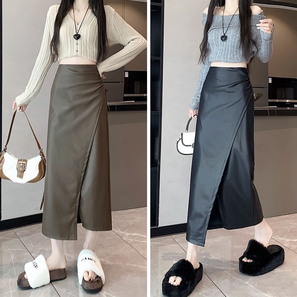 全2色 PUレザー フェイクレザータイトスカート ロングスカート スカート フェイクレザー PUレザー ラップスカート風 巻きスカートデザイン ロング ロング丈 スリム タイト 細身 ストレート Iライン スリット ハイウエスト きれいめ シンプル 大人 上品 おしゃれ お洒落 かっこいい レトロ 大人可愛い 大人女子 クール エレガント 無地 秋 冬レディース OL 通勤 学生 通学 旅行 普段使い 韓国ファッション モテ 美脚 ブラック 黒 茶色 ブラウン