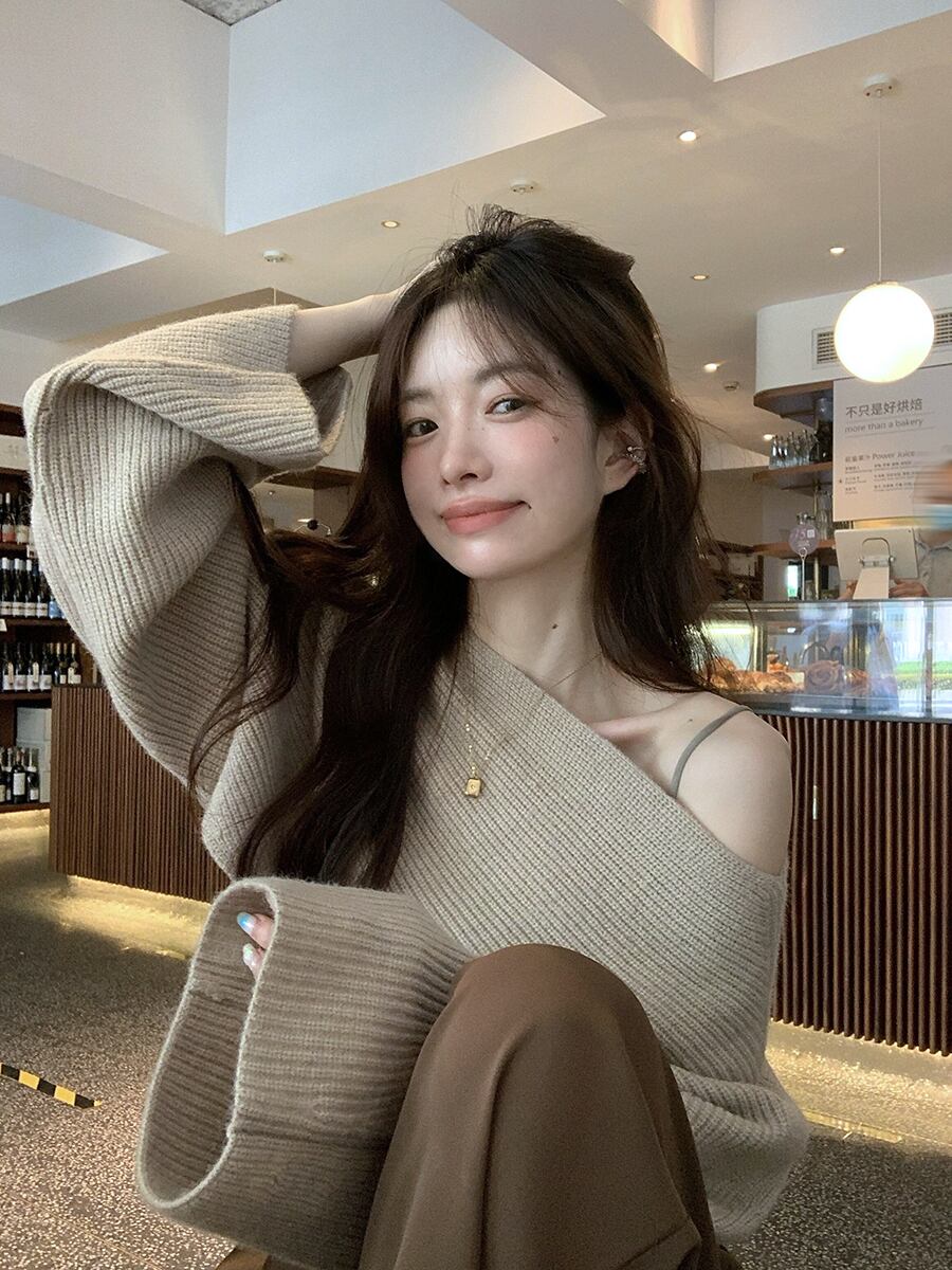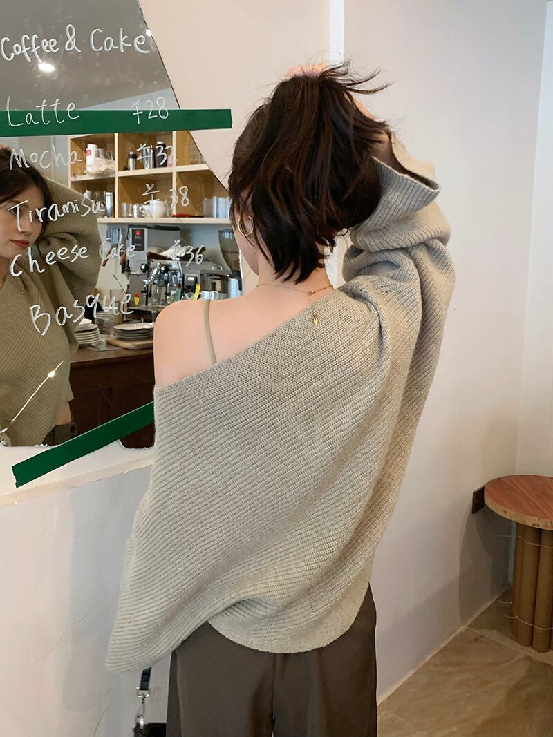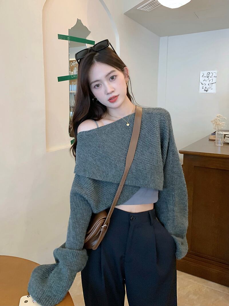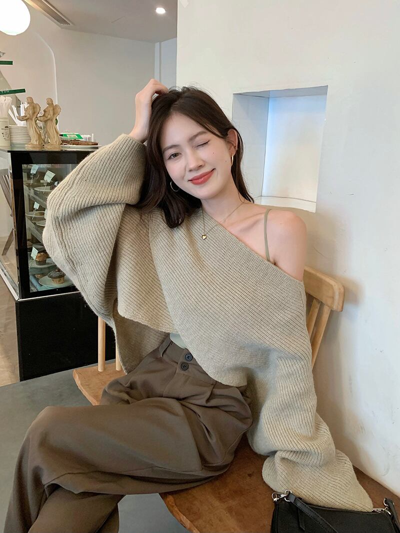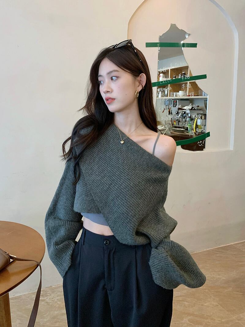 全2色 ルーズニット オフショルニットソー ニットソー セーター ショート ショート丈 袖あり 長袖 ボリューム袖 ドロップショルダー 萌袖 カシュクール フレア ニット かわいい 大人可愛い きれいめ カジュアル 大人 おしゃれ お洒落 かっこいい 大人女子 ラフ キュート 個性的 セクシー 無地 秋 冬 デート お出かけ 女子会 休日 旅行 モテ 脚長 トレンド 流行 グレー カーキ 韓国コーデ