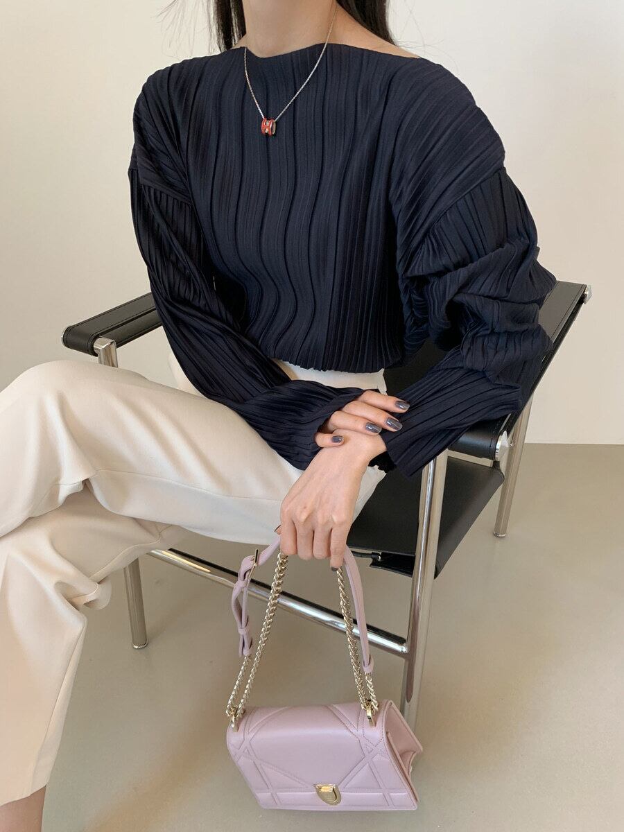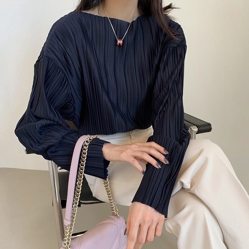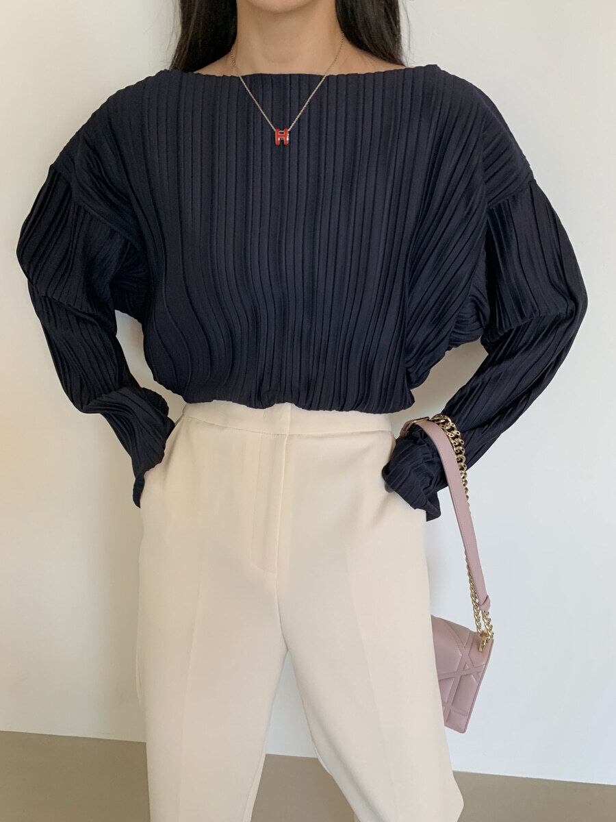 全3色 プリーツブラウス 袖あり 長袖 ラウンドネック 襟なし プルオーバー ルーズシルエット Iライン プリーツ かわいい 大人可愛い きれいめ シンプル 大人 上品 おしゃれ お洒落 かっこいい 大人女子 こなれ感 ラフ 無地 春 秋 冬 10代 20代 30代 レディース オフィス ビジネス OL 通勤 学生 通学 デート お出かけ 公園デビュー 女子会 お泊まり 休日 イベント 旅行 着回し 普段使い 楽ちん モテ サイズ フリーサイズ 色展開 白 グレー 紺 ネイビー 韓国コーデ