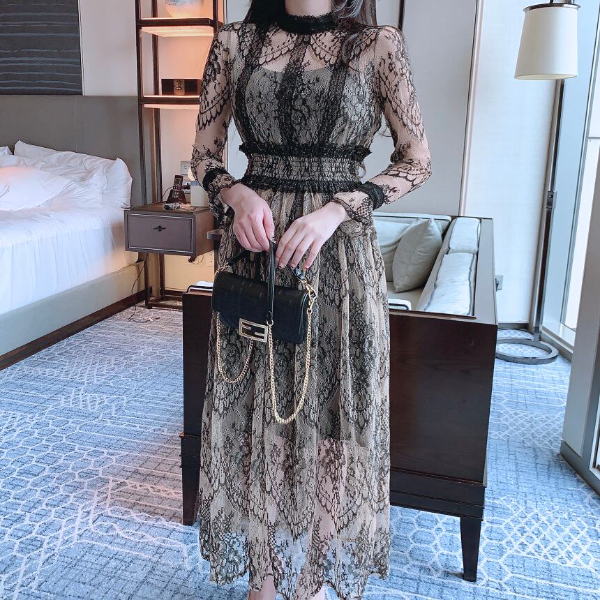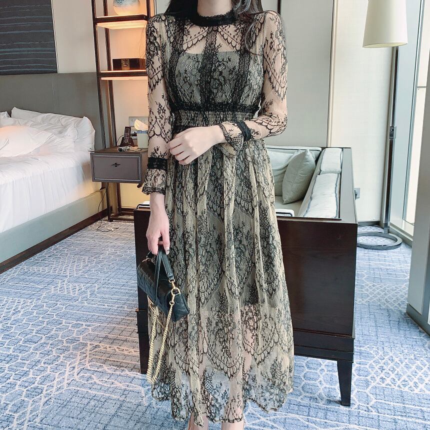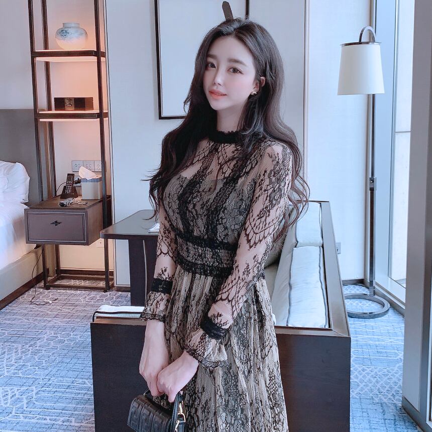 総レースワンピース ワンピドレスシアーワンピース 透け感 膝下 ロング ロング丈 9分丈 長袖 襟付き スリム 細身 ストレート レース チュール かわいい 大人可愛い きれいめ シンプル 大人 上品 おしゃれ キュート エレガント フォーマル 春 夏 秋 冬 オールシーズン 謝恩会 結婚式 二次会 披露宴 冠婚葬祭 10代 20代 30代 パーティー イベント ホテル レストラン 韓国 オルチャン ファッション コーデ モテ サイズ S M L 黒 韓国コーデ
