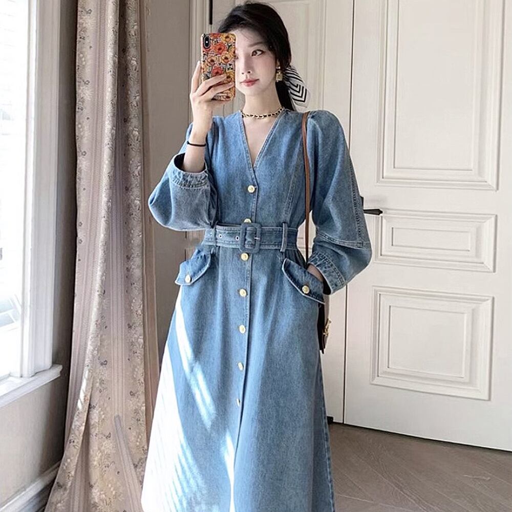 デコルテがすっきり見えるVネックのデニムのロングワンピースです。