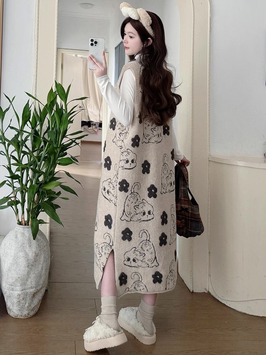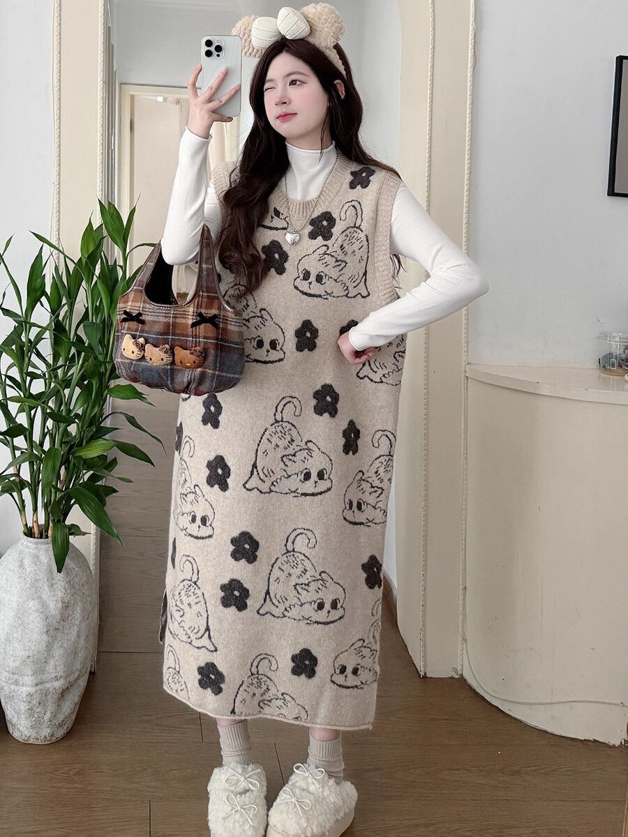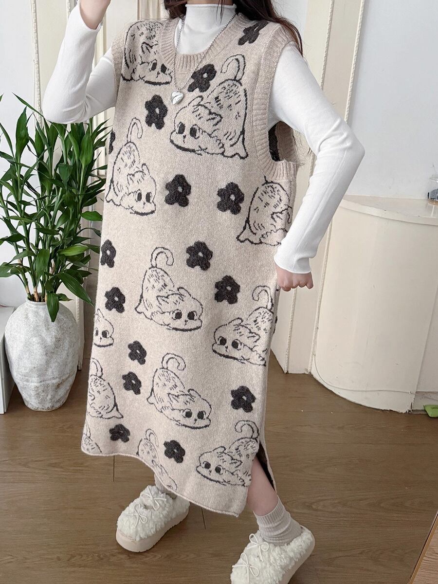 猫イラストデザインラウンドネックニットジャンパースカート ジャンスカ ジレ ロングジレ ロングベスト オーバーサイズ ニットジャンパースカート ニットジャンスカ にゃんこ キャット 編み込み あったか 大きめ トップス ニットソー ラフ ルーズ ルーズ ゆったり 温かい シンプル 大人女子 体型カバー 無地 リゾート 旅行 おしゃれ デート オルチャン 韓国 お出かけ 旅行 普段着 通勤 通学 韓国コーデ 韓国ファッション ベージュ