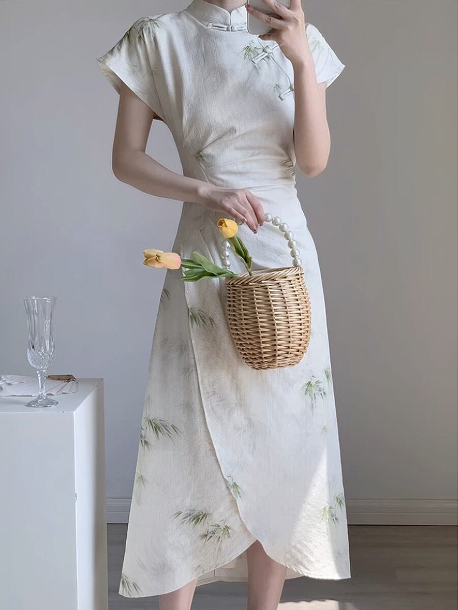 竹柄 バンブープリント アオザイ チャイナドレス チャイナ服 チャイナ風トップス 膝下 ミモレ丈 ミモレ レディース トップス シック 大人っぽい モノトーン ナチュラル感 大人しめ シフォン 大人可愛い きれいめ シンプル 大人 上品 おしゃれ レトロ スリット 深スリット 盘扣 パンコウ チャイナボタン スタンドカラー ノースリーブ 大人女子 クール エレガント レディース 会合 パーティ 食事会 デート お出かけ 女子会