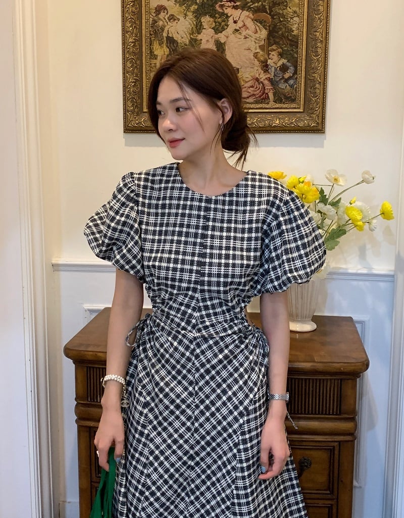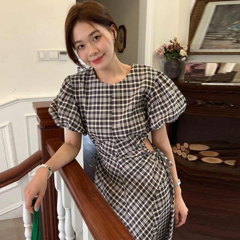 サイドオープン チェック柄ラウンドネックワンピース ワンピース お嬢様風 ロング ミモレ 半袖 ちら見せ 細身 ウエストリボン ウエストギャザー かわいい 大人可愛い きれいめ シンプル カジュアル おしゃれ お洒落 かっこいい レトロ 大人可愛い 大人女子 こなれ感 ラフ ラ 個性的 レディース ビジネス OL 通勤 学生 通学 デート お出かけ リゾート 韓国コーデ 韓国ファッション オルチャン 白黒チェック フレア Aライン