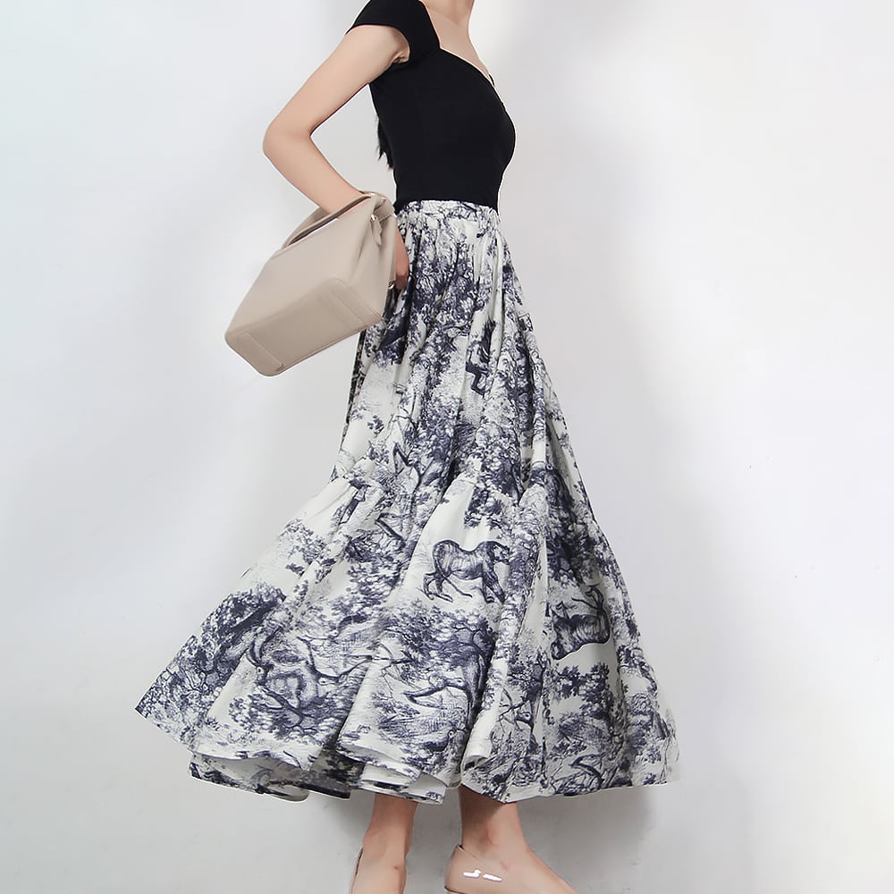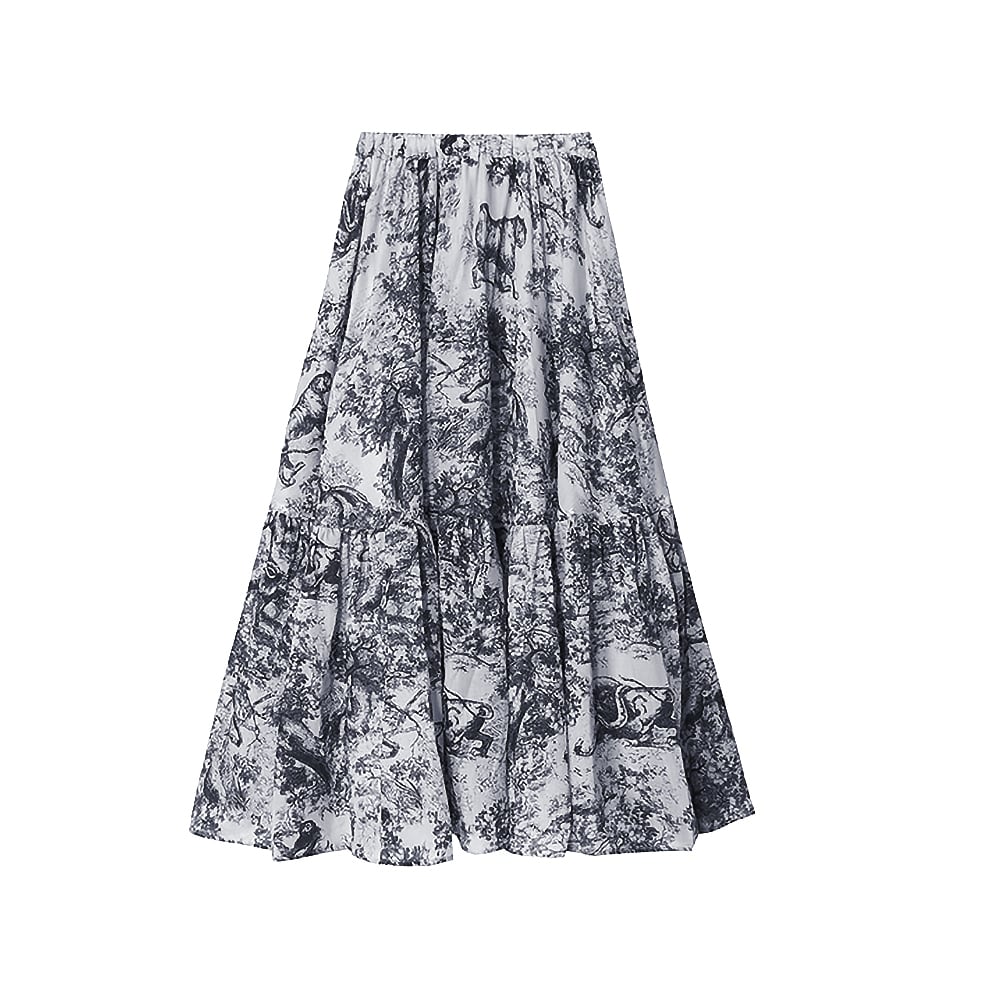 ティアードスカート トワルドジュイ柄 フレンチレトロ柄 ロココ調 フレンチスタイルジュイ 上品 おしゃれ お洒落 かっこいい レトロ ヨーロッパデザイン フレアロング アニマル 動物柄 ウエストゴム 体型カバー 楽ちんスカート 切り替えフレア 大人可愛い 大人女子 ホームパーティ 個性的 レディース エレガント 通勤 学生 通学 デート お出かけ 女子会 レストラン 韓国コーデ 韓国ファッション オルチャン