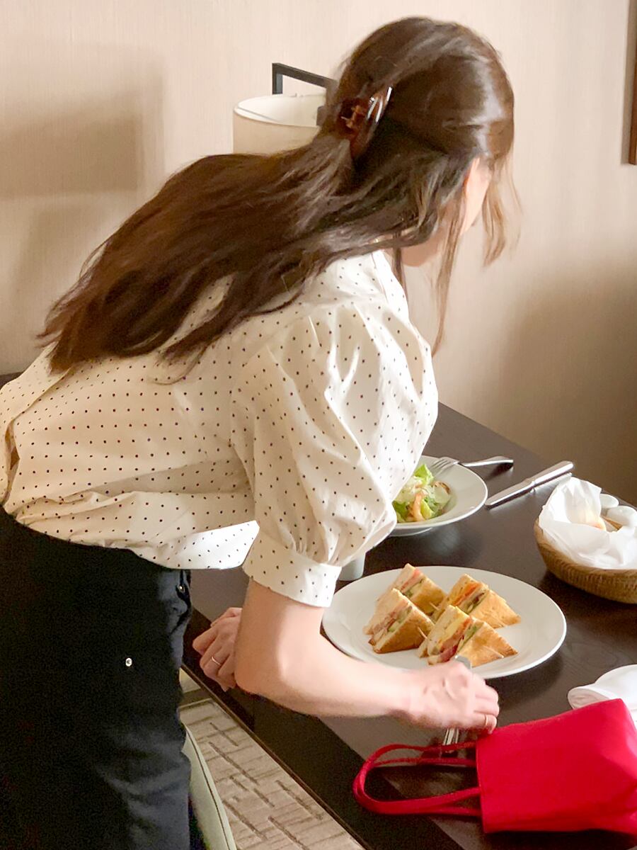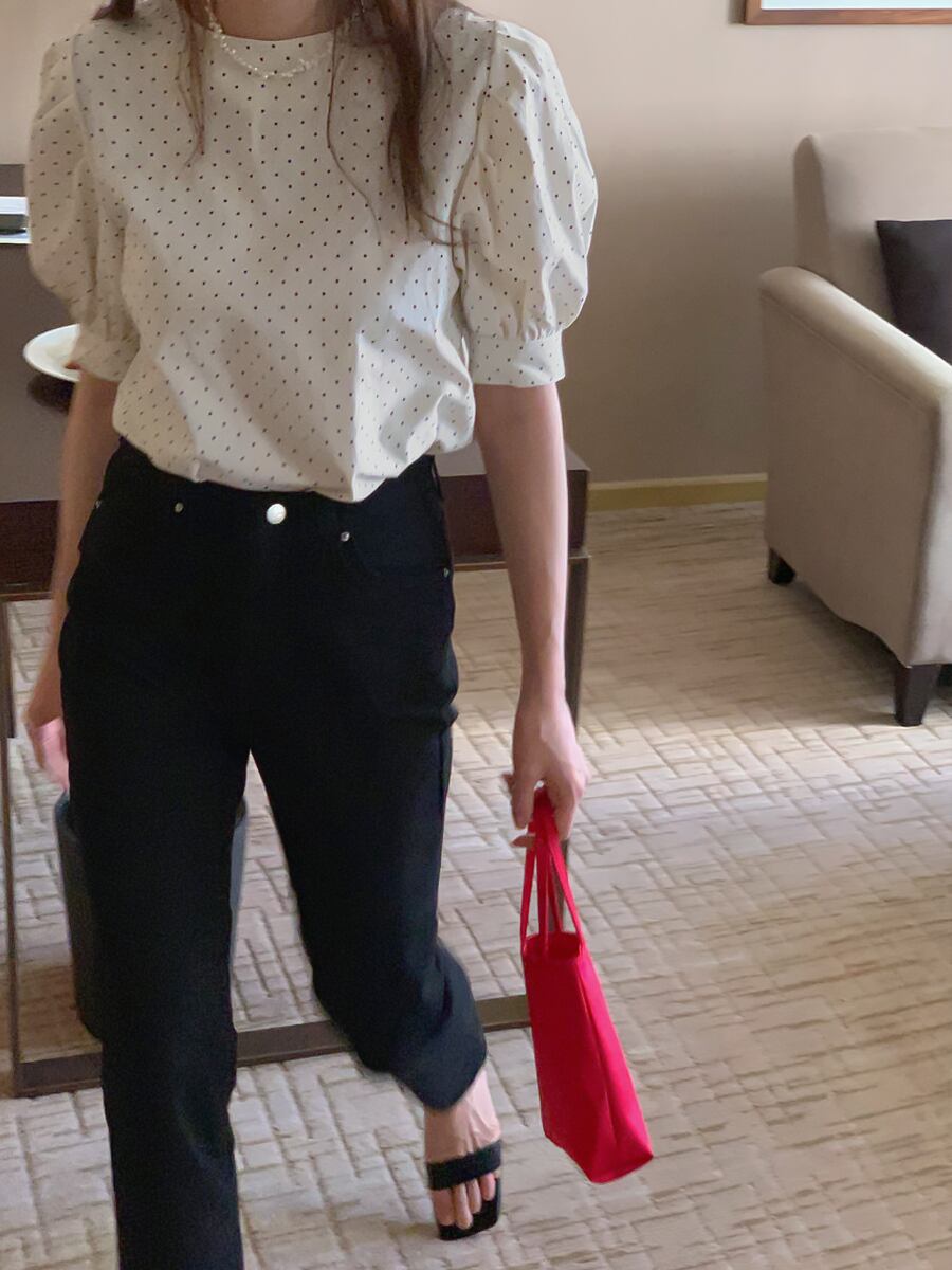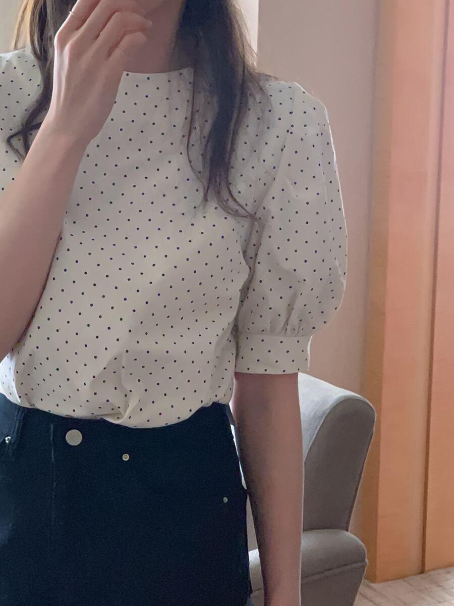 水玉ブラウス 半袖 水玉シャツ パフスリーブ トップス フェミニン ラウンドネック ドット柄シャツ ドット柄ブラウス 丸首 かわいい 大人可愛い きれいめ シンプル カジュアル 大人 上品 おしゃれ お洒落 大人可愛い 大人女子 こなれ感 ラフ レディース ビジネス OL 通勤 学生 通学 デート お出かけ 公園デビュー 女子会 お泊まり 休日 旅行 ホテル ガーデン レストラン 双子 ファッション 韓国コーデ 韓国ファッション 白 黒