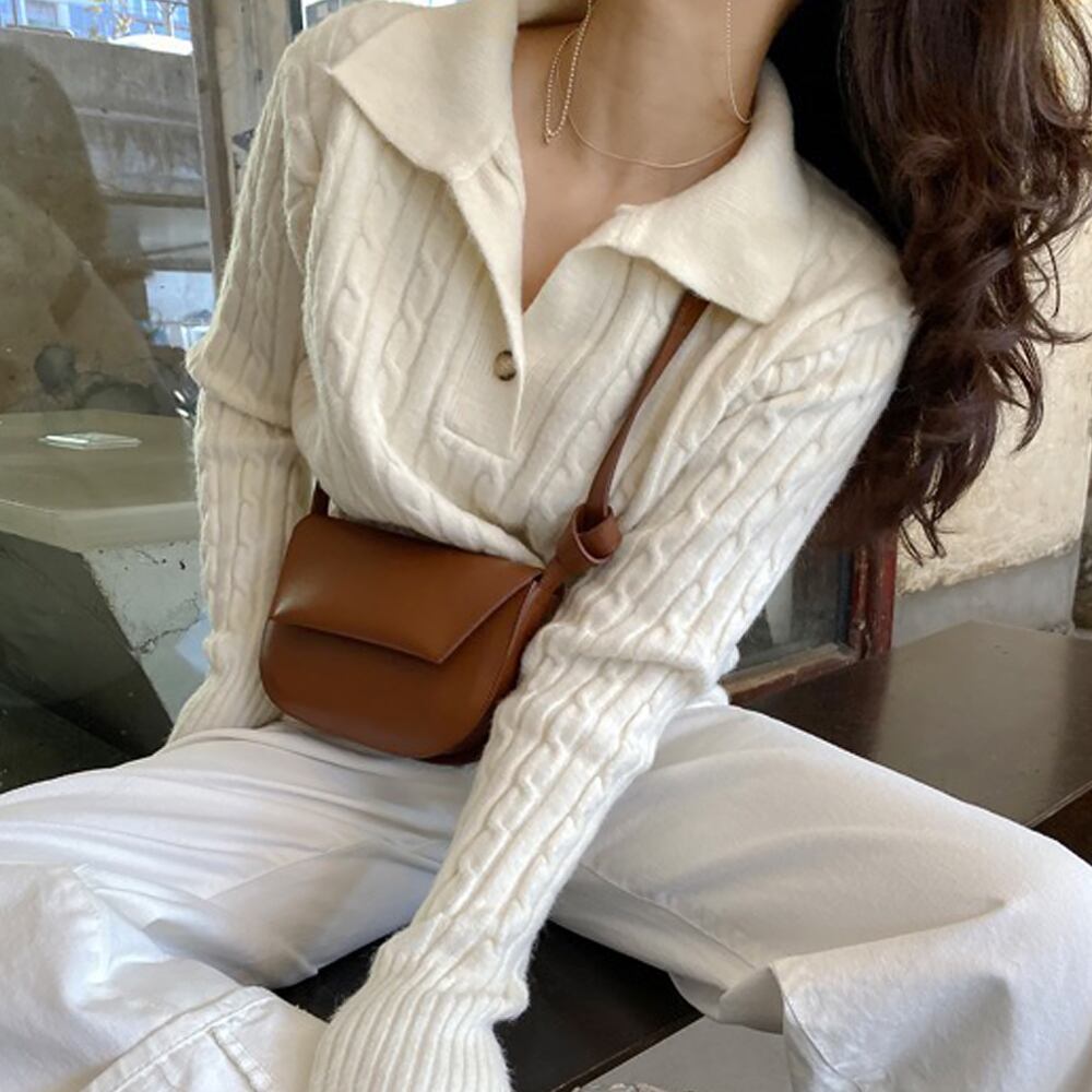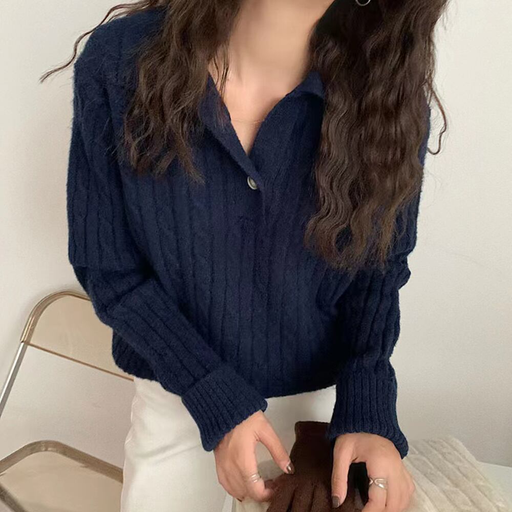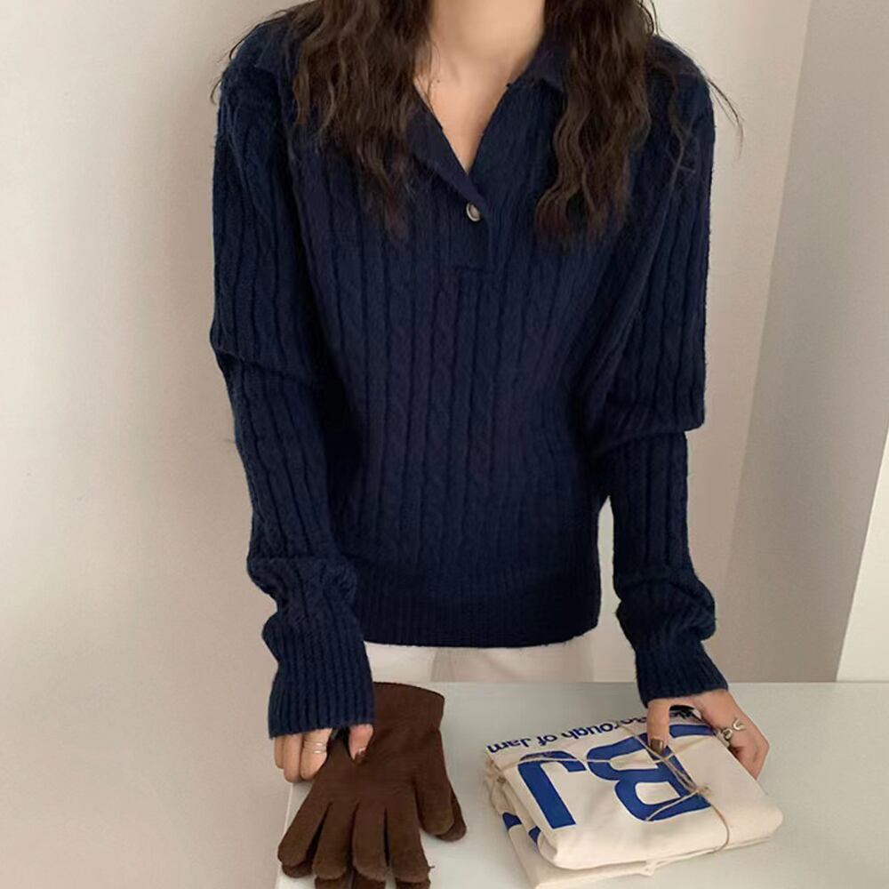 全3色 ケーブルニットポロセーター セーター レギュラー丈 長袖 襟付き ポロカラー 前開き ケーブルニット ニット ストリート メンズライク ワンボタン 大人可愛い シンプル カジュアル 大人 おしゃれ お洒落 レトロ 大人女子 こなれ感 ラフ 個性的 冬 10代 20代 30代 40代 50代 レディース 女性用 オフィス OL 通勤 デート お出かけ 女子会 休日 旅行 ショッピング 普段使い 楽ちん 暖かい オフホワイト 紺 韓国ファッション 韓国コーデ アイボリー 緑 黒