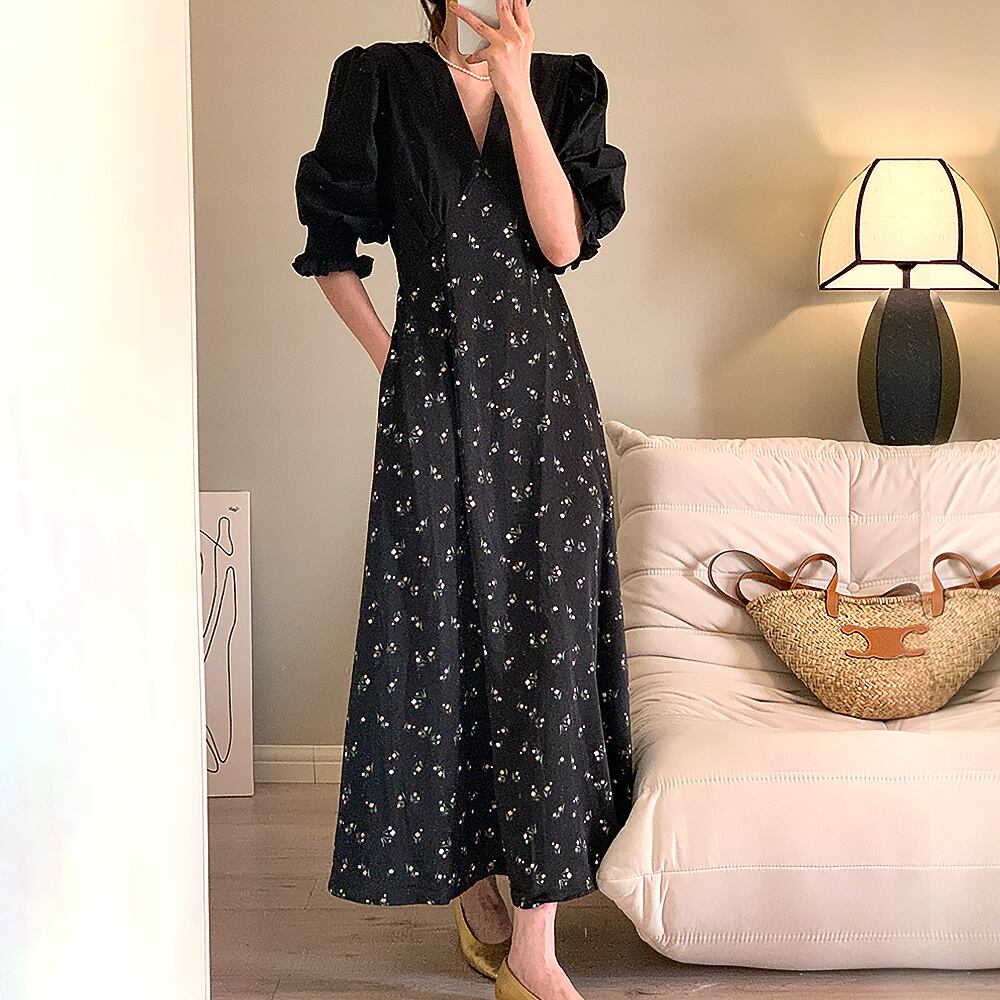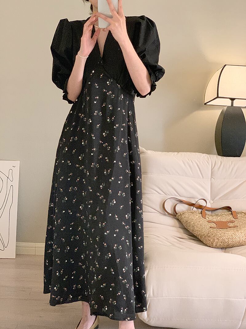 花柄 フレアワンピース 半袖 ロング丈 Vネックス 切替 ドッキング エレガント 胸元切替 黒字花柄 ブラック 夏ワンピ 夏コーデ サマースタンダード シフォンスリーブ フローラルシフォン かわいい 大人可愛い きれいめ シンプル カジュアル 大人 上品 おしゃれ お洒落 かっこいい レトロ 大人可愛い 大人女子 こなれ感 ラフ ラブリー キュート 個性的 レディース ビジネス デート お出かけ 女子会 パーティー イベント 韓国ファッション 韓国コーデ オルチャン