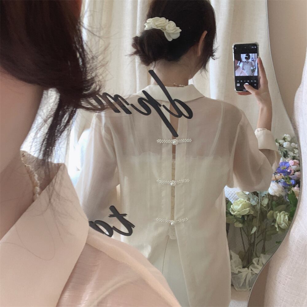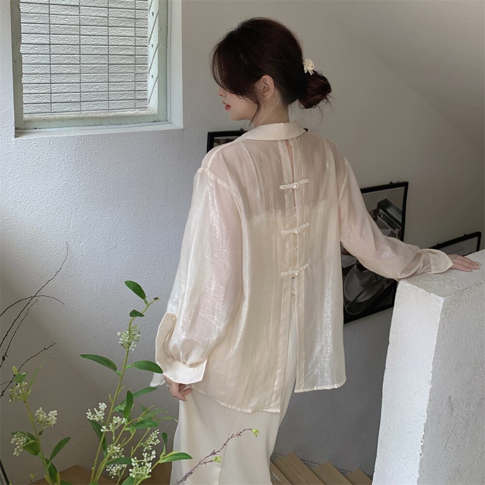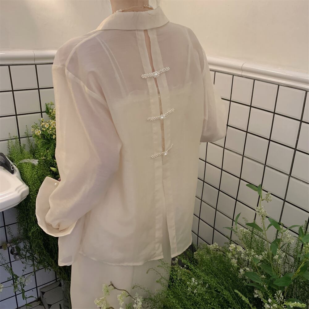 シアーシャツ チャイナボタン バックボタン ブラウス 大きいサイズ シアーブラウス シフォン バックスリット 袖あり 長袖 Vネック 襟付き ストレート 大人可愛い きれいめ きちんと感 きれいめ シンプル カジュアル 上品 おしゃれ お洒落 大人女子 こなれ感 重ね着 シースルー 透け感 ルーズ ゆる ゆったり エレガント 卒業式 卒園式 入学式 入園式 存在感 フォーマル 無地 シーズンレス 10代 20代 30代 40代 50代 オルチャン 韓国コーデ 韓国ファッション