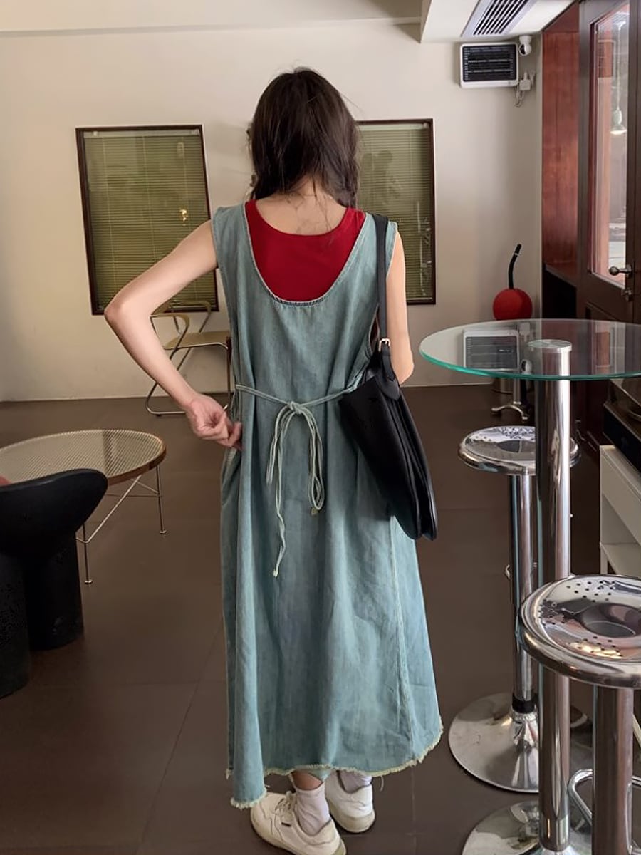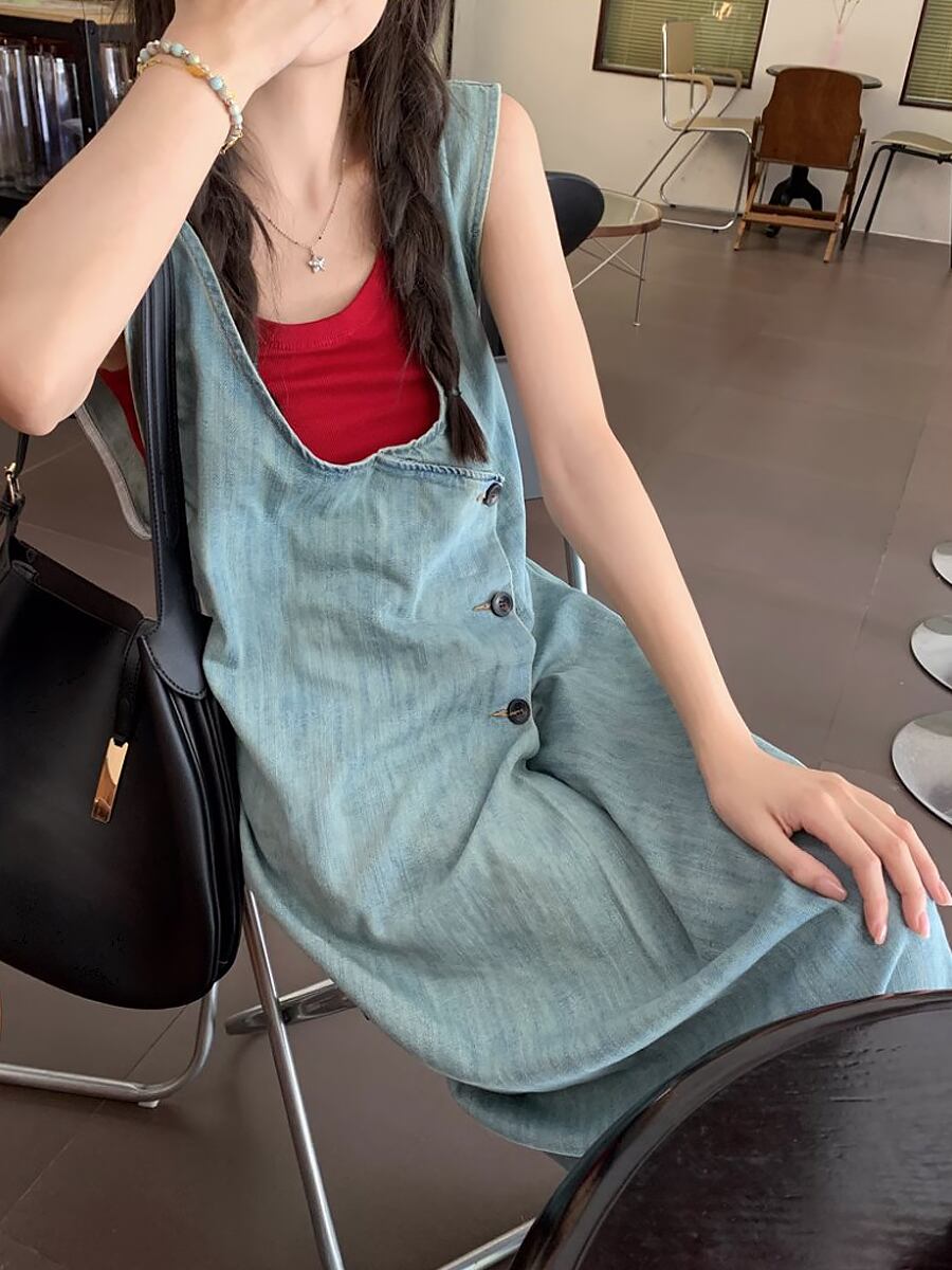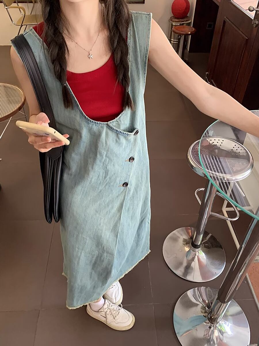 シンプルデニムロングジャンパースカート サロペットスカート アシンメトリー フリンジ ミモレ丈 ミディアム丈 リラックスコーデ ゆったり 楽ちん 襟なし ボタン 着やすい かわいい 大人可愛い きれいめ シンプル 上品 おしゃれ お洒落 かっこいい レトロ 大人女子 こなれ感 ラブリー ガーリー 個性的 オールシーズン エレガント モダン 無地 シーズンレス デニム 韓国コーデ 韓国ファッション デニムブルー ブルー