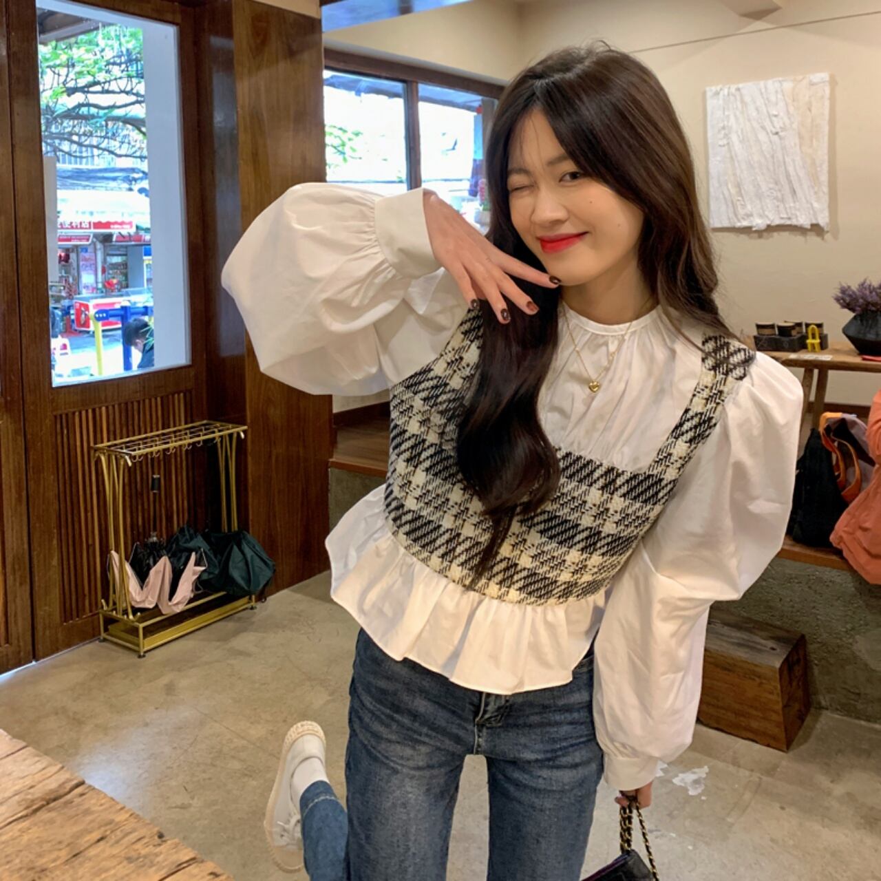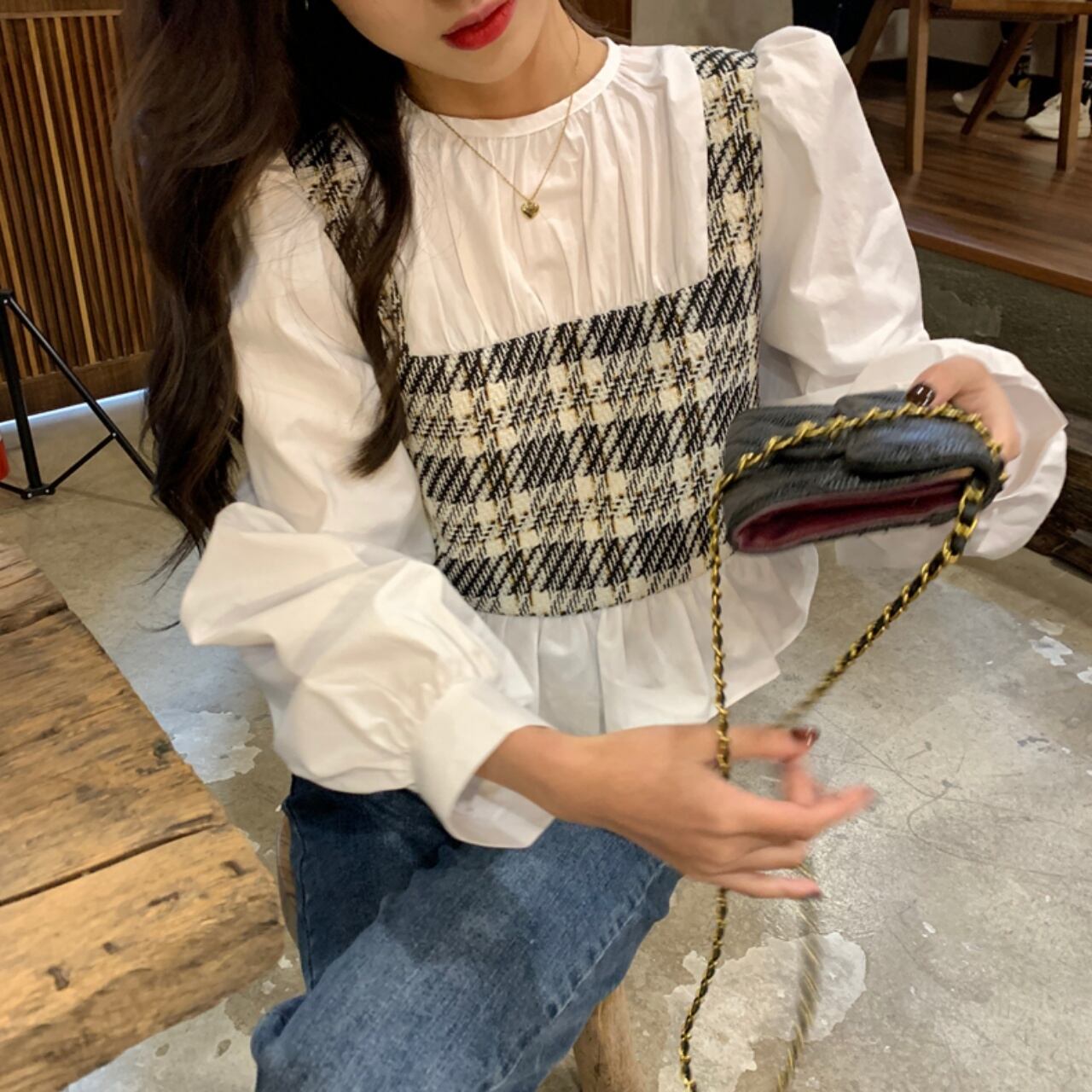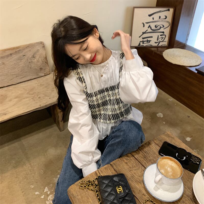 重ね着風 ドッキングシャツ 袖あり 長袖 ラウンドネック 襟なし フリル ドッキング かわいい 大人可愛い シンプル カジュアル 大人 おしゃれ 大人女子 こなれ感 ラフ キュート 主役級 存在感 無地 チェック柄 春 秋 10代 20代 30代 レディース 学生 通学 デート お出かけ 公園デビュー 女子会 休日 旅行 着回し 普段使い 韓国 オルチャン ファッション コーデ スタイル フリーサイズ ホワイト
