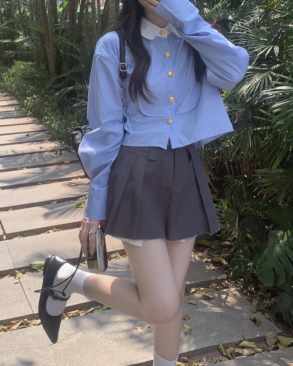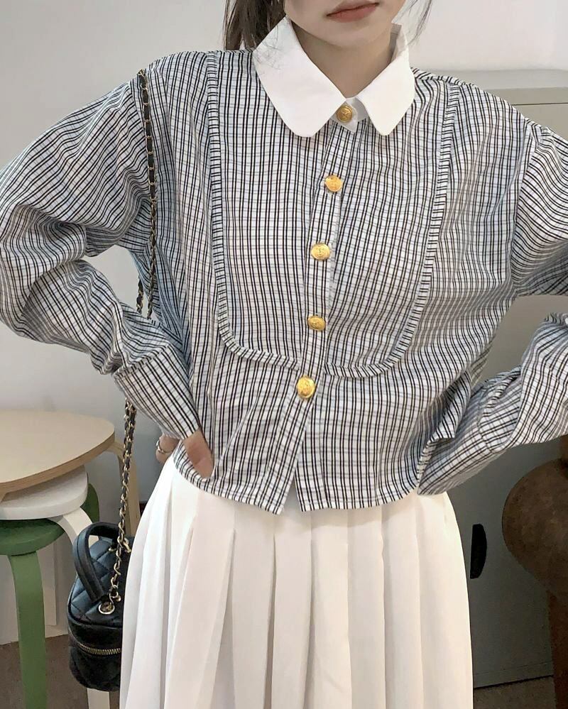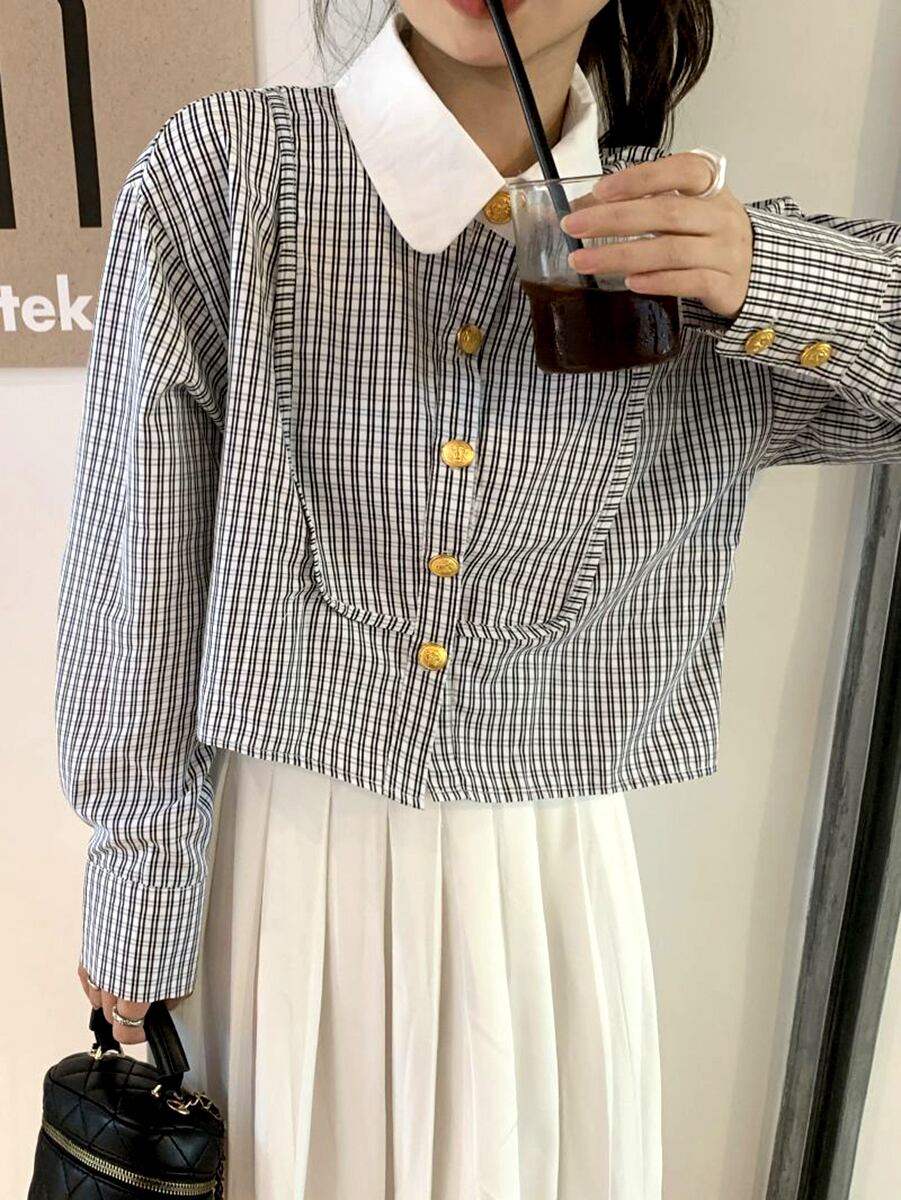 全2色 フレンチチェック ドールカラー シャツ 金ボタン ミニ丈 ショート丈 袖あり 長袖 襟付き 前開き かわいい 大人可愛い きれいめ シンプル 大人 上品 おしゃれ 大人女子 こなれ感 ラフ キュート 主役級 存在感 無地 チェック柄 春 秋 10代 20代 30代 レディース オフィス ビジネス OL 通勤 学生 通学 デート お出かけ 公園デビュー 女子会 休日 着回し 普段使い 重ね着 韓国 オルチャン ファッション コーデ スタイル フリーサイズ ホワイト ブラック ブルー