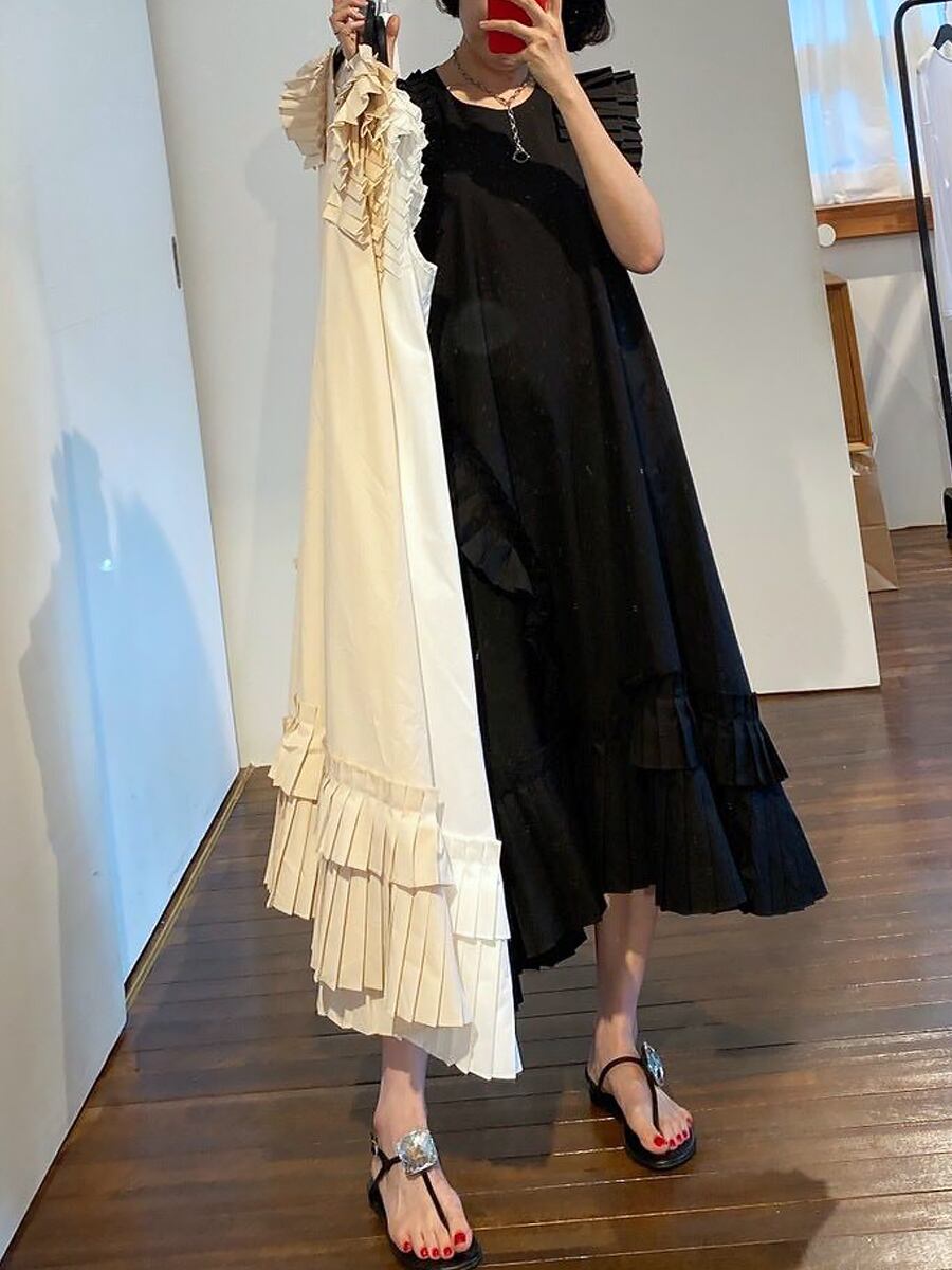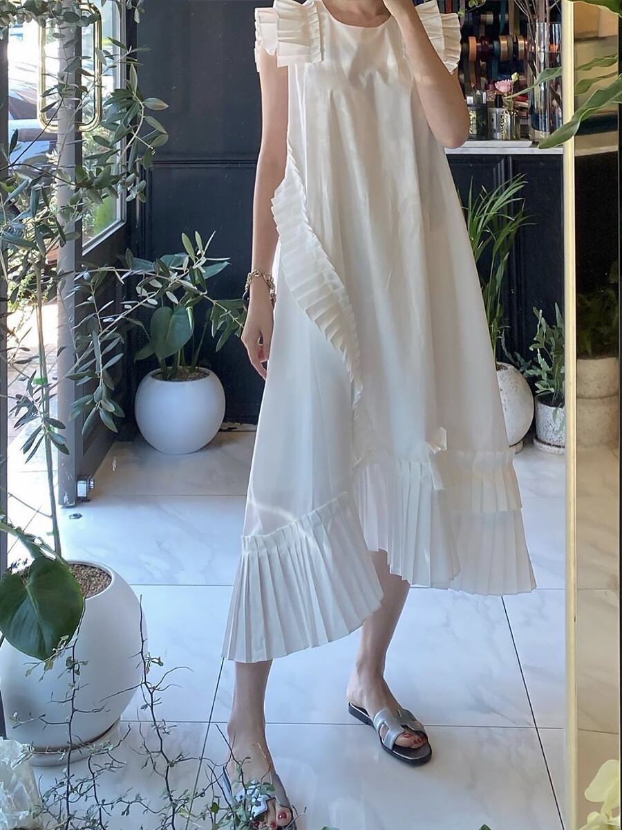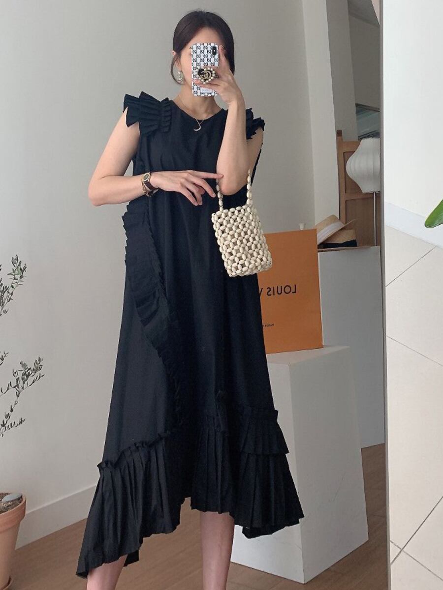 全3色 フリルノースリーブワンピース アシンメトリー プリーツ 部分プリーツ Aラインワンピース フレンチスリーブ 肩フリル 裾フリル フレア Aライン ゆる ゆったり 体型カバー ロング ロング丈 ナチュラル フレア かわいい 大人可愛い カジュアル 大人 おしゃれ 大人可愛い 無地 春 夏 10代 20代 30代 40代 レディース デート お出かけ 旅行 普段使い 休日 フリーサイズ ホワイト ブラック ベージュ 韓国コーデ 韓国ファッション 黒 白