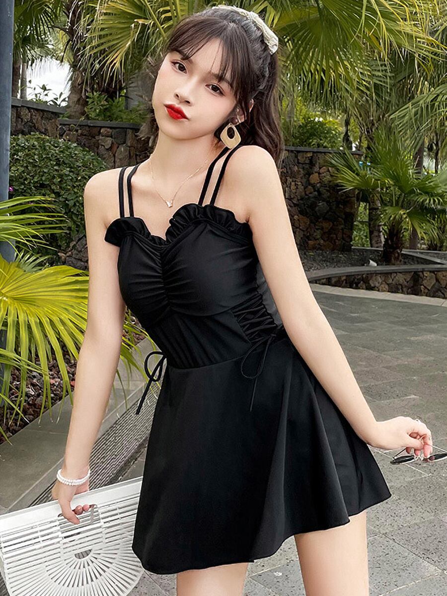 水着 セパレート スカート付きサイドレースアップワンピース水着+ボーイレッグパンツ ビスチェ風 肩ひも サイドレース サイド編み上げ バッククロス フレア フレアスカート フリル レースアップ シャーリング 切り替えデザイン 露出度少なめ ハイウエスト かわいい 大人可愛い ラブリー キュート ブラック 温泉 レディース ツーピース 海 ビーチ プール リゾート 二の腕カバー 美脚 脚長 着痩せ 韓国系 オルチャン オルチャン 韓国コーデ 韓国ファッション 黒