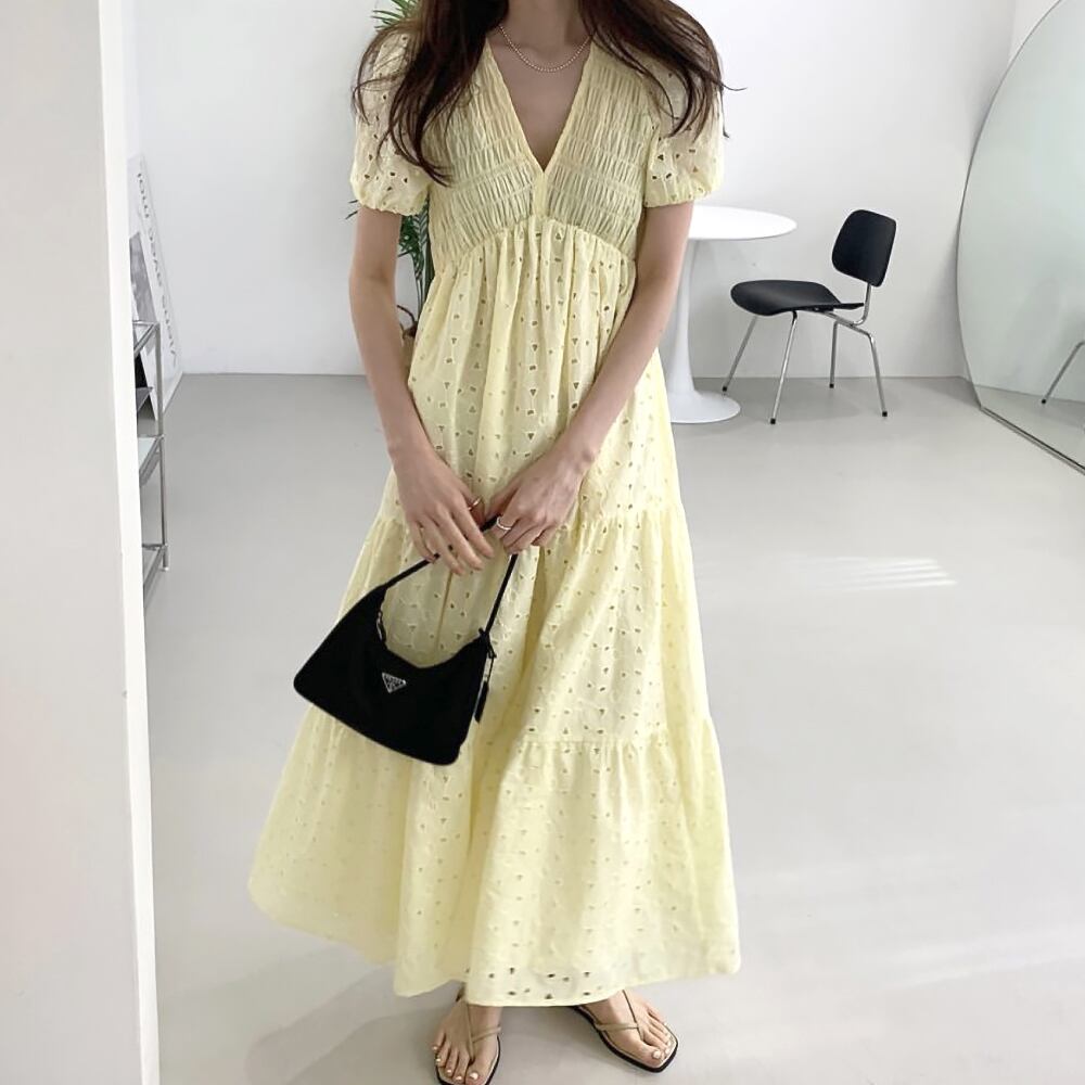 全4色 シャーリング ロングワンピース ワンピース パンチングワンピース カットワークレース 夏ワンピ 夏ワンピース Vネック 切り替え 裾フリル フラワーレース 背中シャーリング 着痩せ かわいい 大人可愛い きれいめ カジュアル 大人 おしゃれ 大人可愛い ガーリー ラフ ラブリー キュート 個性的 レディース ビジネス OL 通勤 学生 通学 デート お出かけ 海 リゾート 旅行 韓国ファッション 韓国コーデ オルチャン 緑 黒 白 黄色